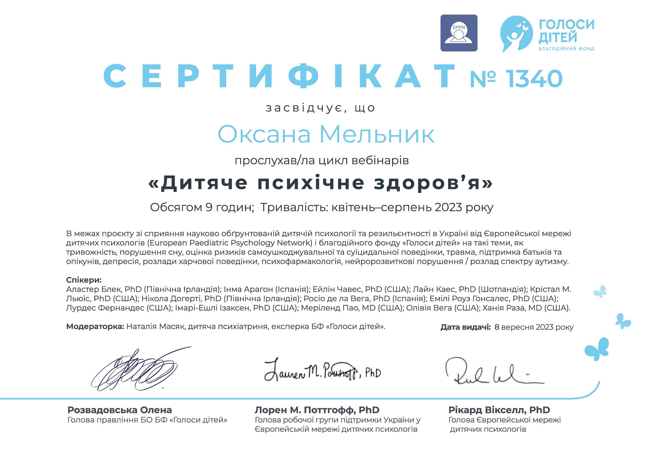 - Психічне здоров'я дітей (European Paedietric Psychology Network, курс навчання терапевтичній роботі з дітьми з тривожністю, суїцидальною поведінкою, депресія та розлади харчової поведінки, 9 годин (серпень 2023)
