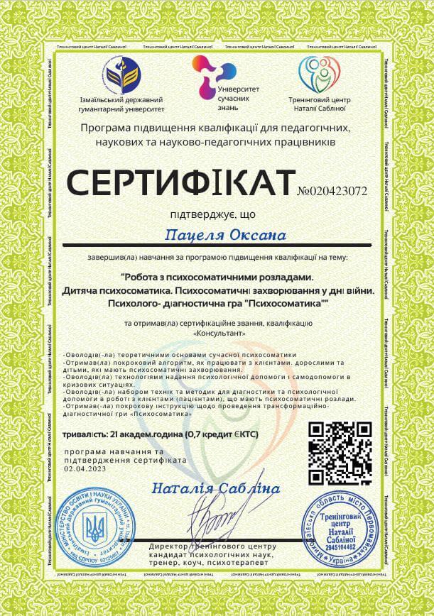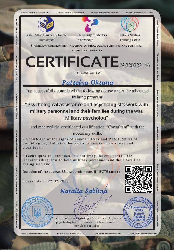 В своїй практиці застосовую гештальт підхід, тілесну терапію, методи виходу зі стресу, стабілізації емоційних станів, інтеграції травматичного досвіду, елементи коучингу.