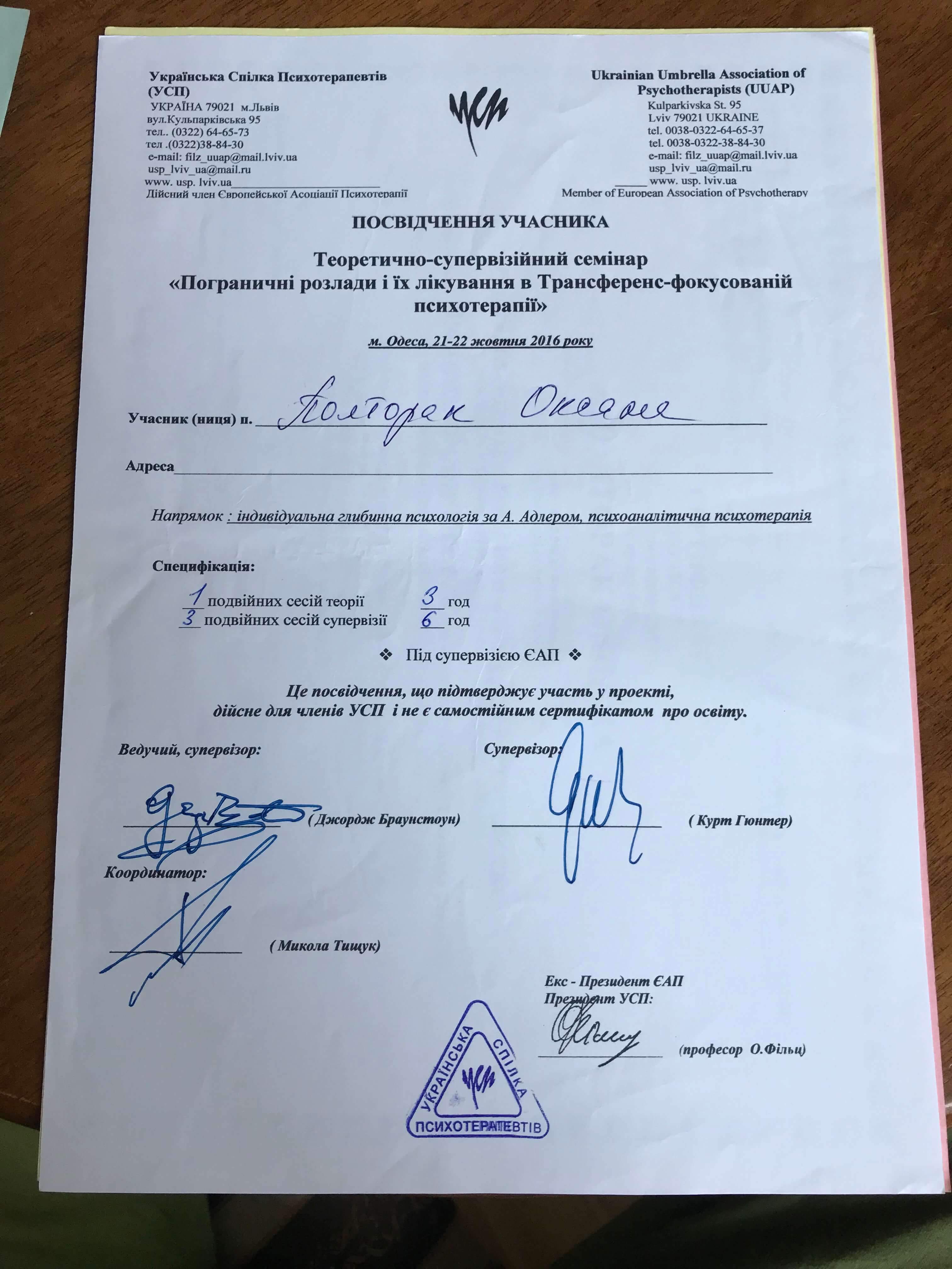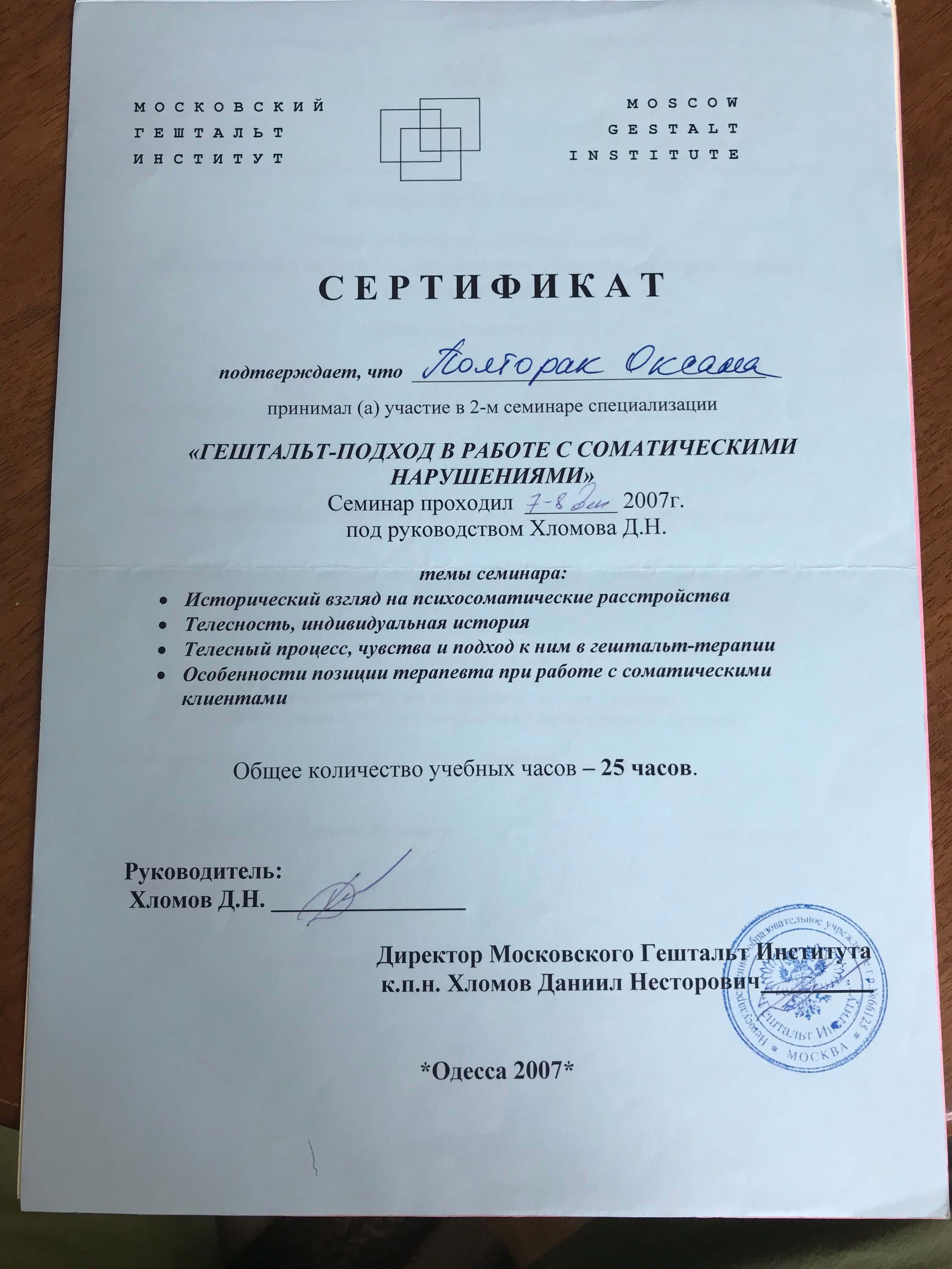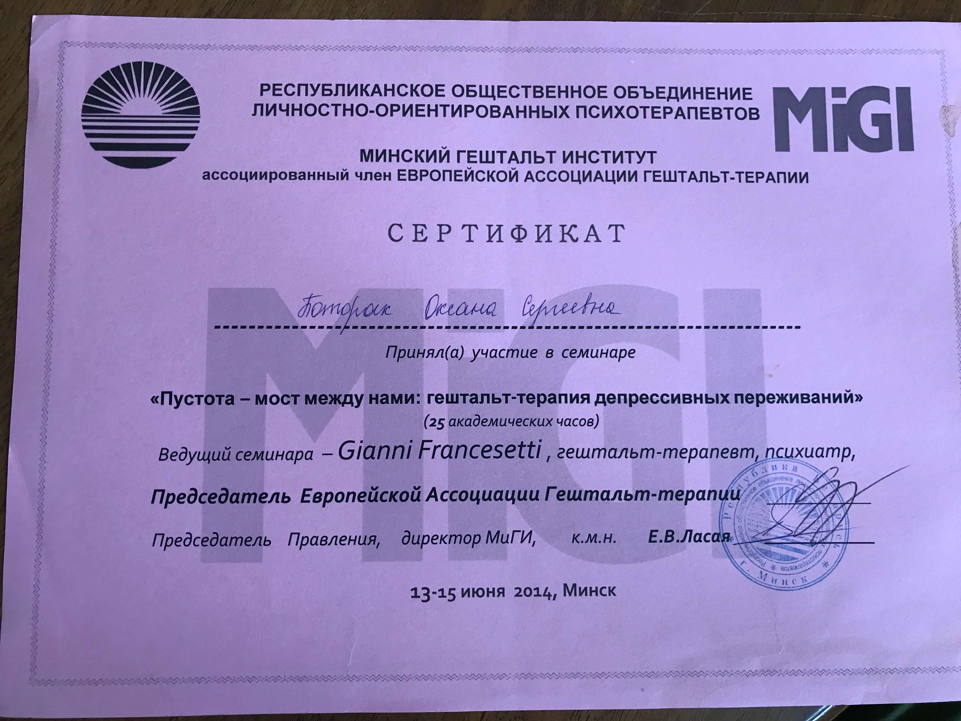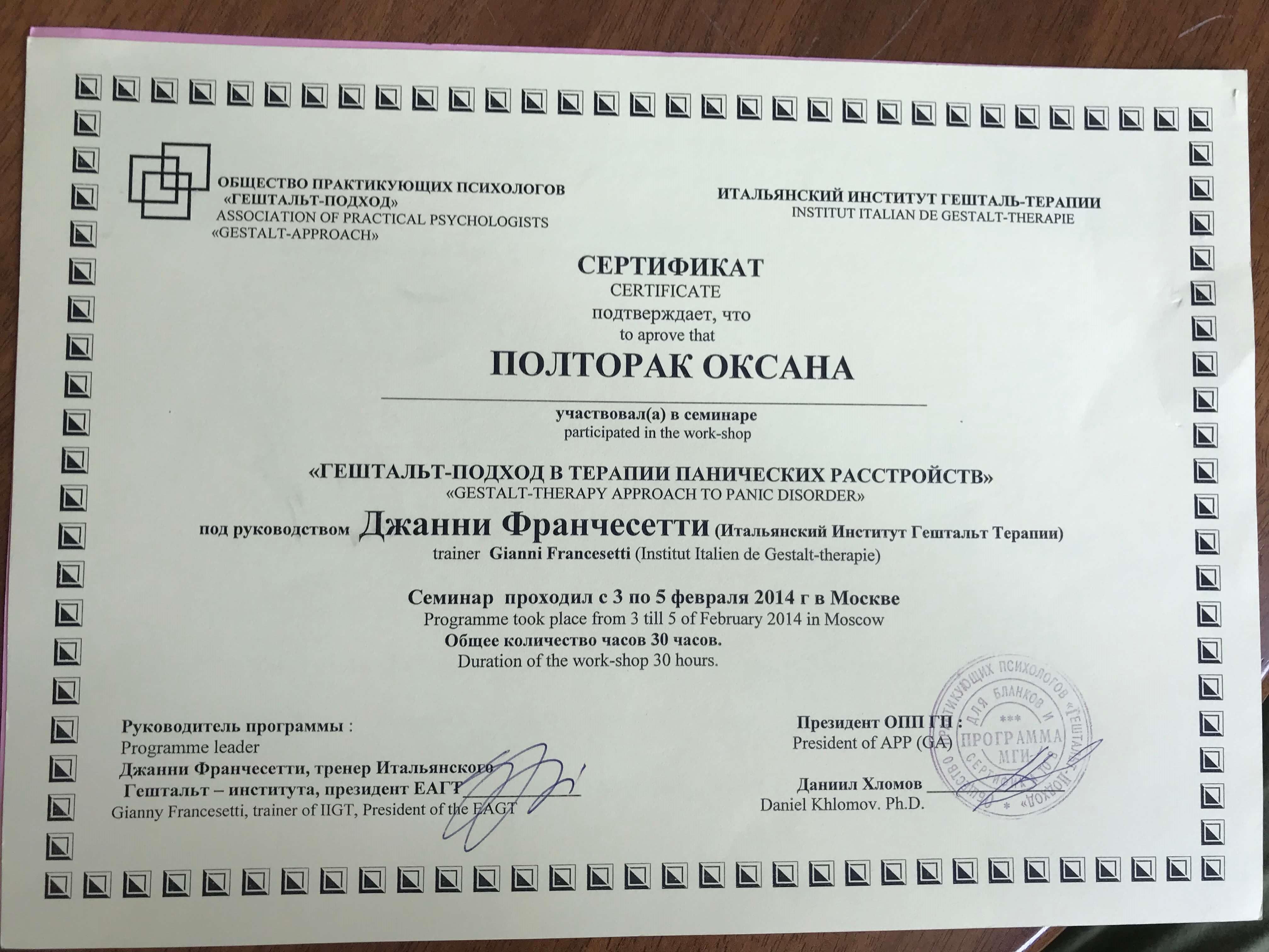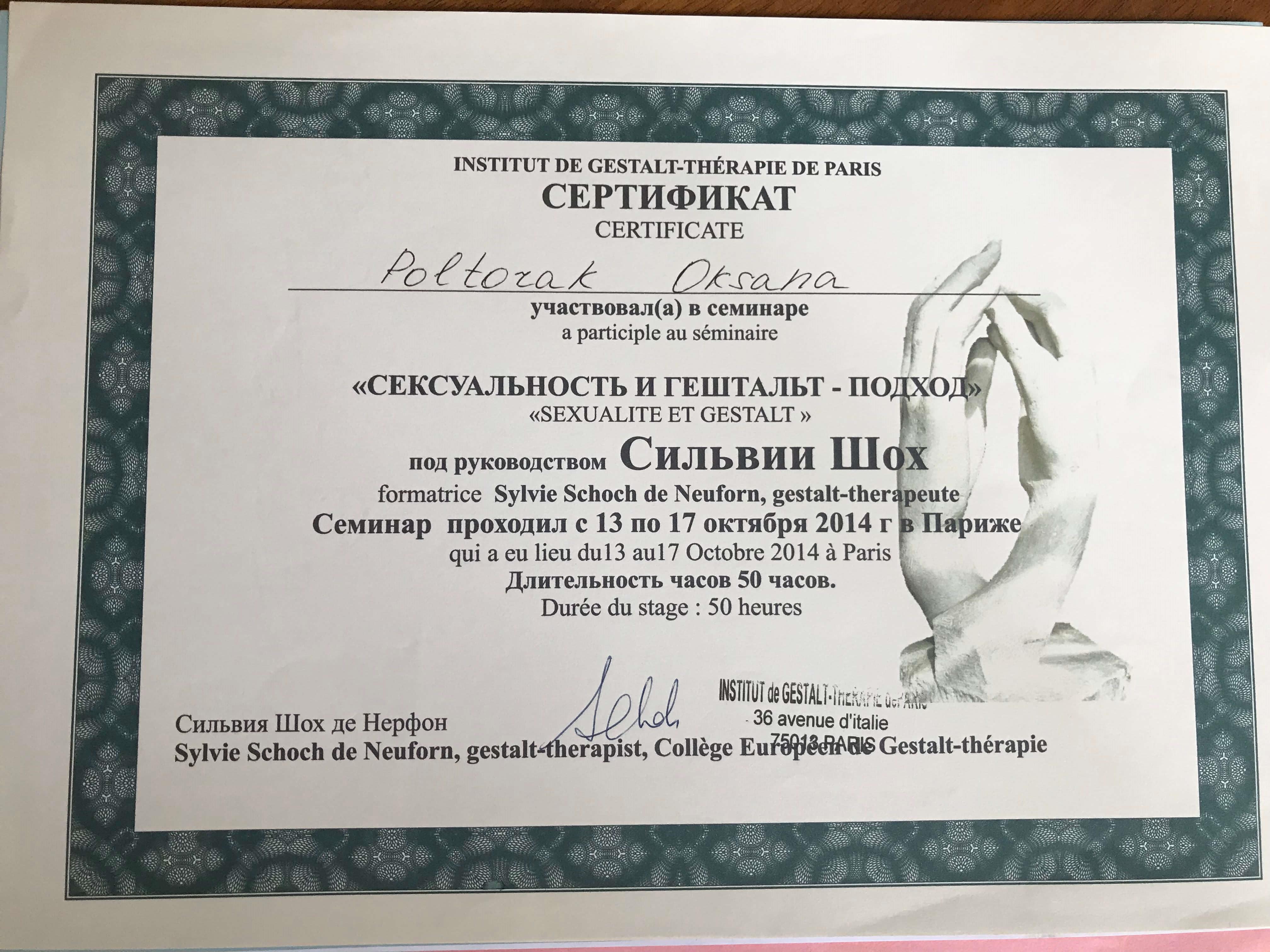 Програма підготовки гештальт терапевтів Український Гештальт Інститут 2006-2013, сертифікат гештальт терапевта, супервізора, викладача гештальт терапії.