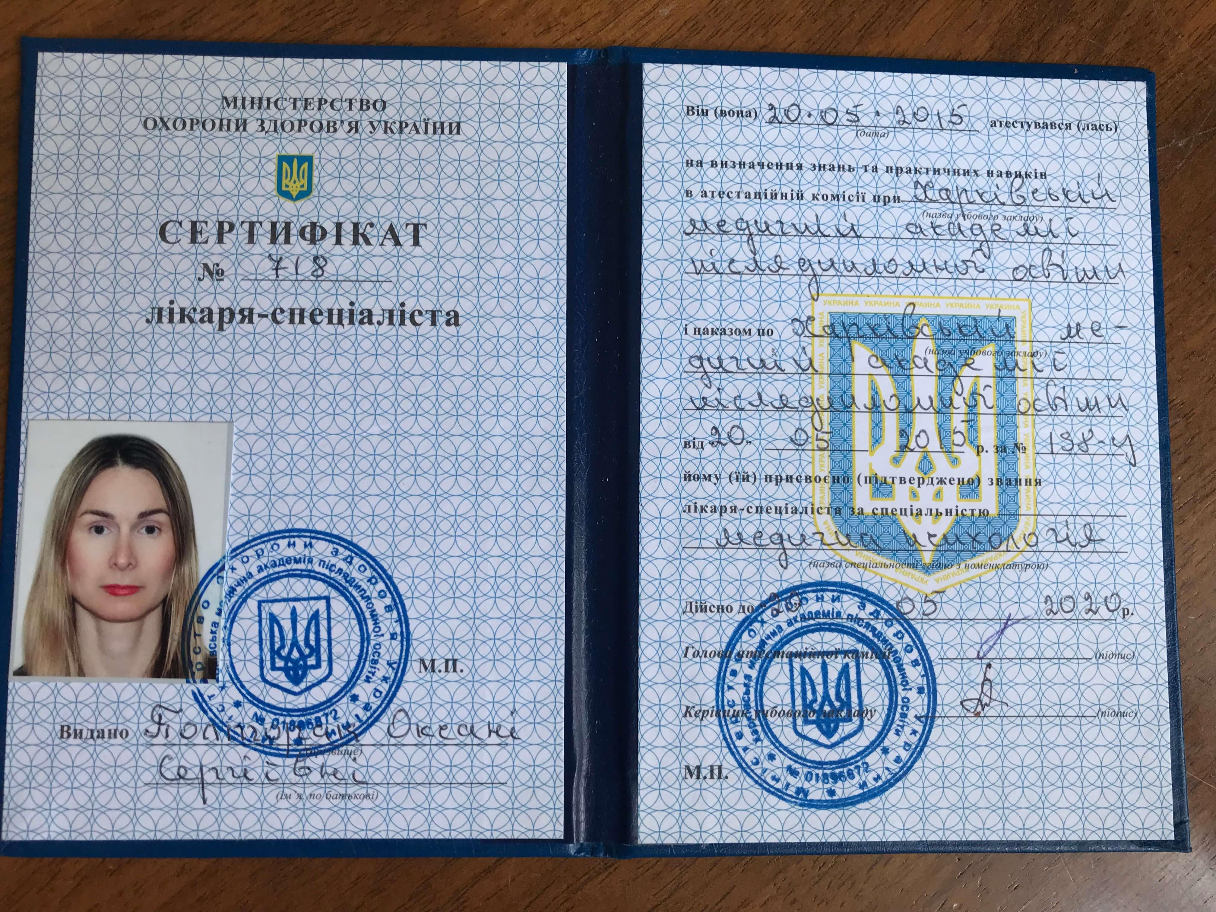 Одеський медичний університет 1991 рік, диплом лікаря педіатра; Харківська Медична Академія післядипломної освіти, кафедра медичної психології та сексології 2015, 2023 р. державний сертифікат медичного психолога.
