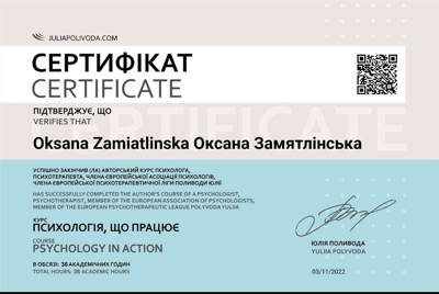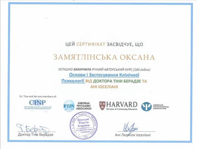 Авторській курс медичного психолога, члена психіатрів Гарвардського університету, члена європейськогї асоціацїїпсихотерапевтів та отримала сертифікат : «Основи і застосування Клінічної психології» – 160 год та сертифікат: «Психотерапія на практиці» – 160 год