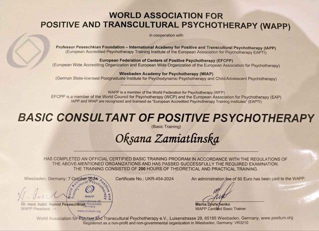Використовую науково підтверджені методі терапії та інтегративно особистісний підхід.