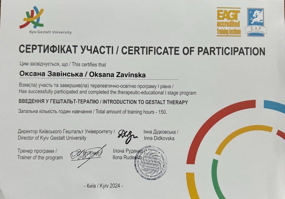 Мене звати Оксана, і я — гештальт-терапевтка у навчанні, яка закохана у те, про що робить.