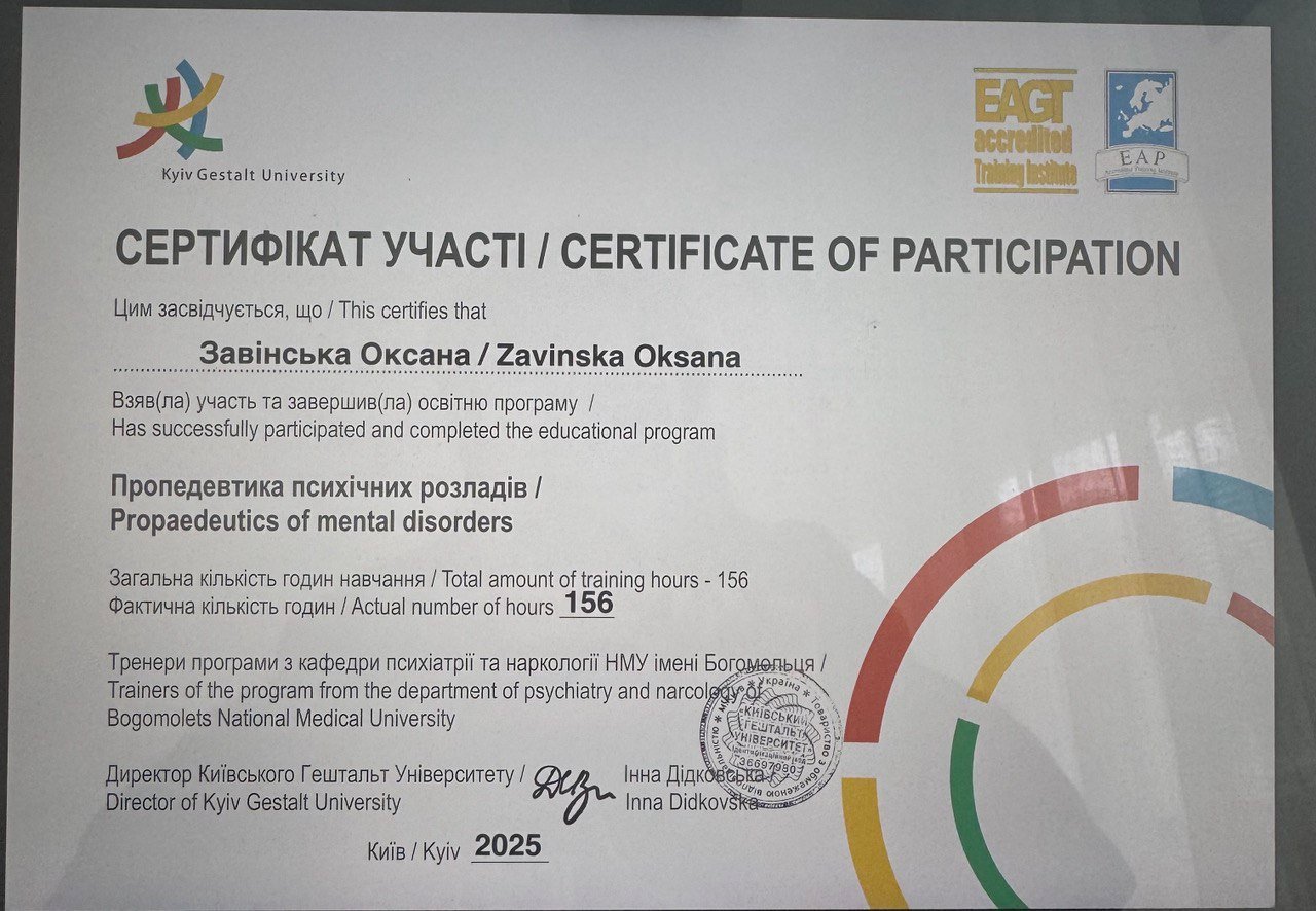 Навчаюся на гештальт терапевта в Київському гештальт інституті, специалізація "Психосоматика" в КГУ. Магістра психології в МАУП.