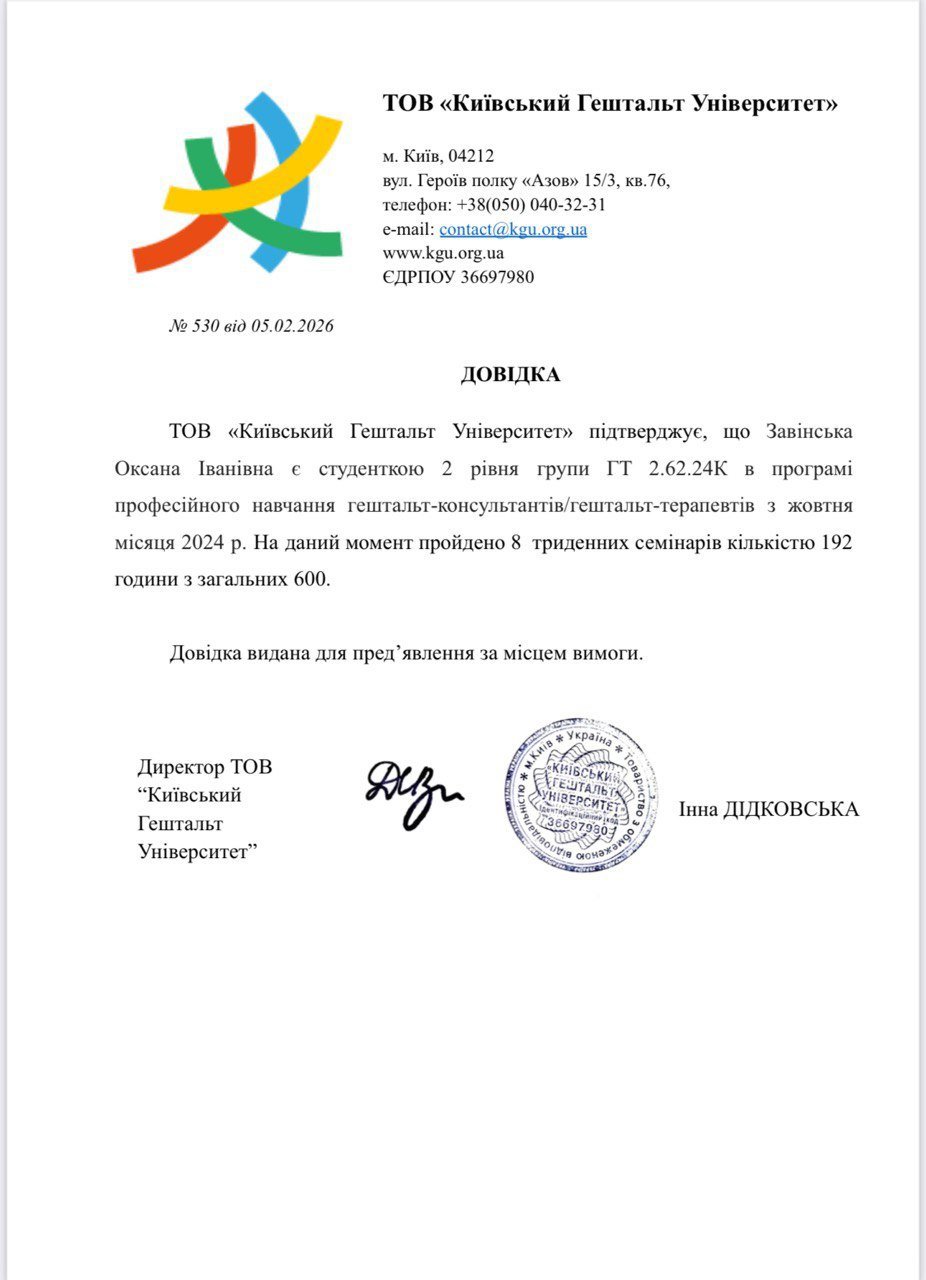 Також навчаюся на магістра психології, проходжу спеціалізацію “Психосоматика і робота з тілесними процесами”. Регулярно у терапевтичних групах, на супервізії, у проектах саморозвитку.