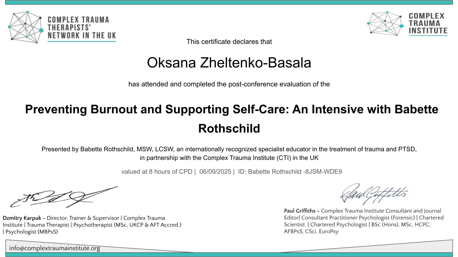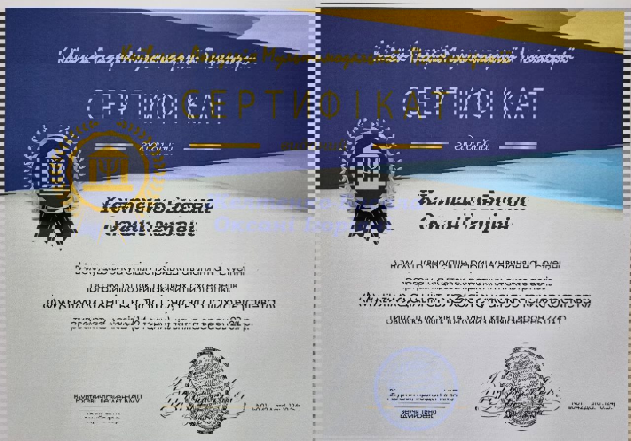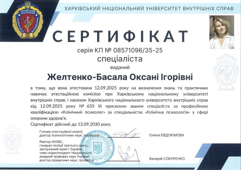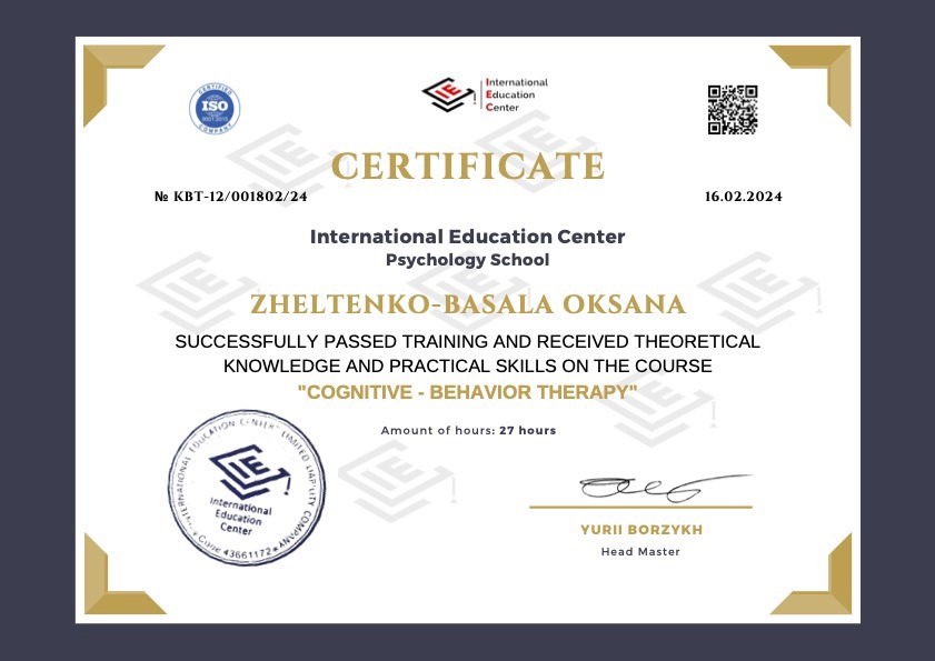 Вітаю! Мене звати Оксана. Клінічний психолог та психотерапевт в навчанні: проходжу навчання в 5-річному проекті (Український Психотерапевтичний Університет, напрямок “Психоаналіз”); член УСП (Українська Спілка Психотерапевтів). В роботі використовую інтегративний (мультимодальний) підхід: елементи КПТ, гештальт терапії, АСТ, арт-терапія, IFS (терапія внутрішніх сімейних систем) та інші. Маю безперервне додаткове навчання; пропедевтика психіатрії, супервізії та інтервізії– в наявності.