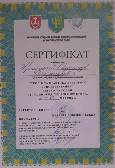 Сертифікат Української асоціації фахівців з подолання наслідків психотравмуючих подій