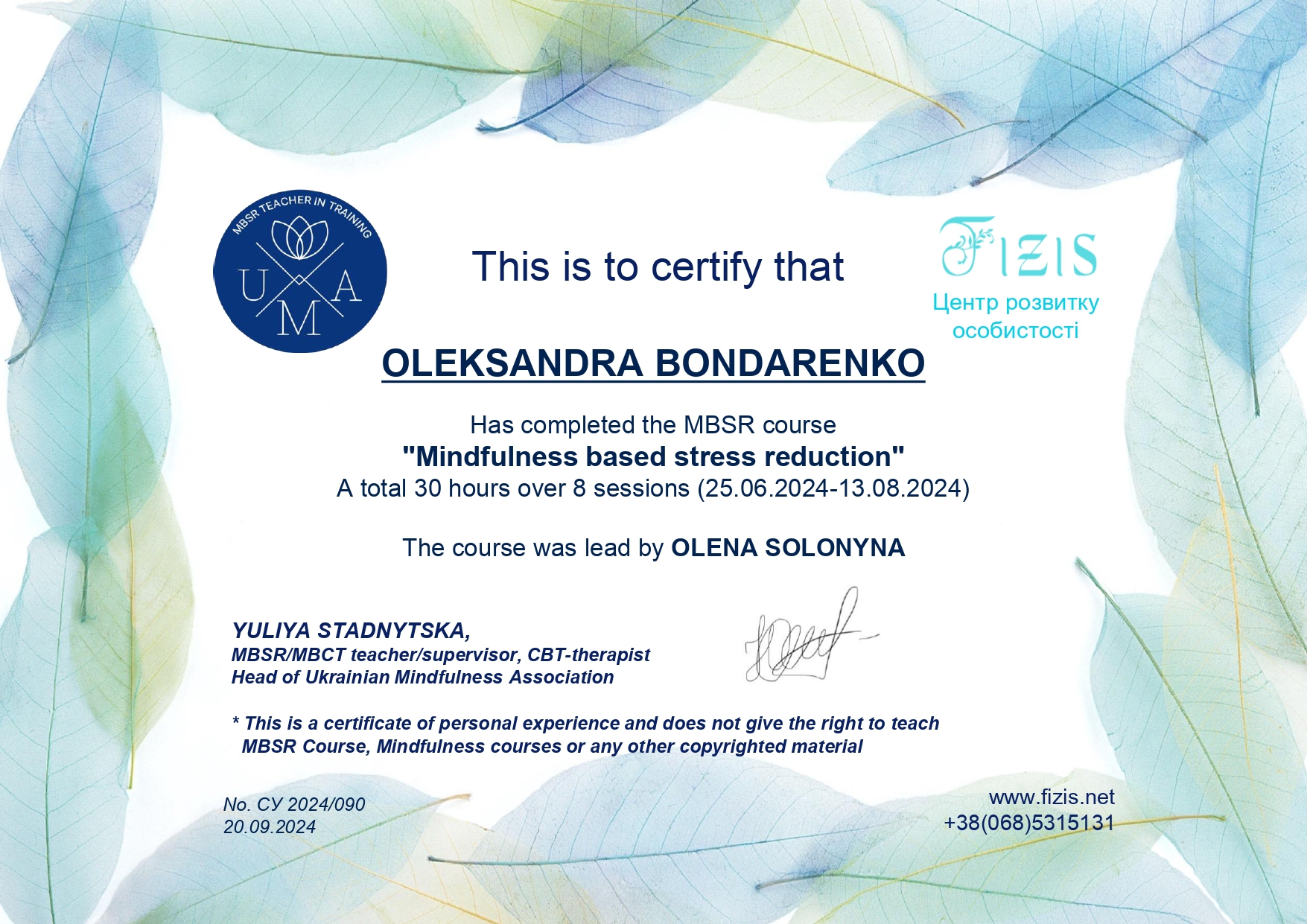 MBSR ПРОГРАМА ЗНИЖЕННЯ СТРЕСУ НА ОСНОВІ УСВІДОМЛЕНОСТІ, Курс власного досвіду.