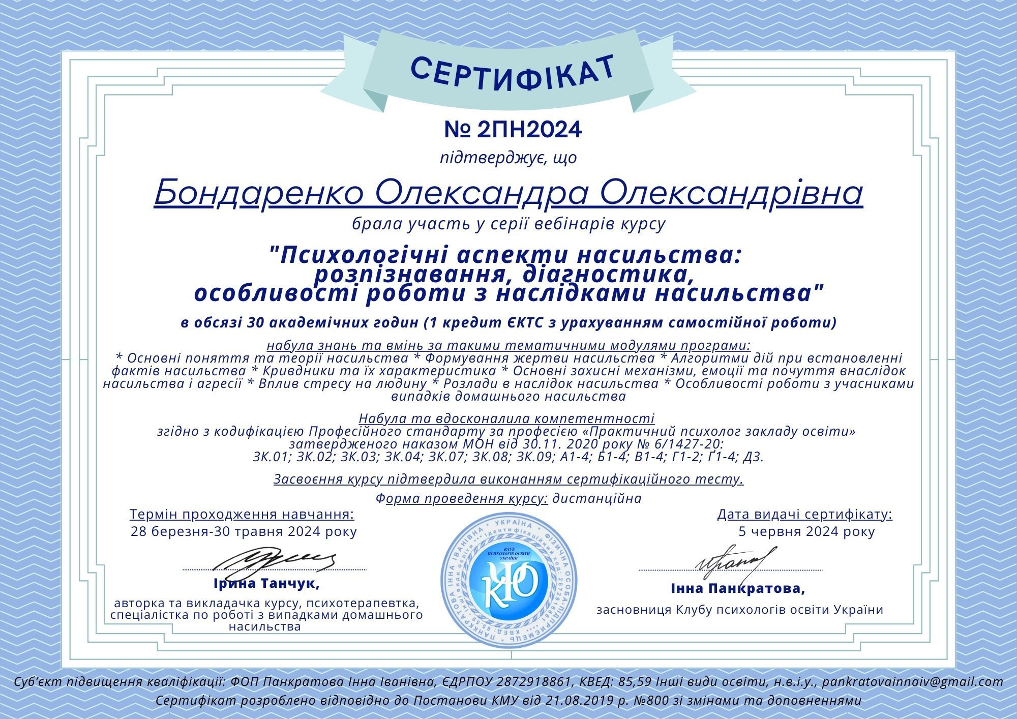 28 березня-30 травня 2024 року, Кількість годин - 30