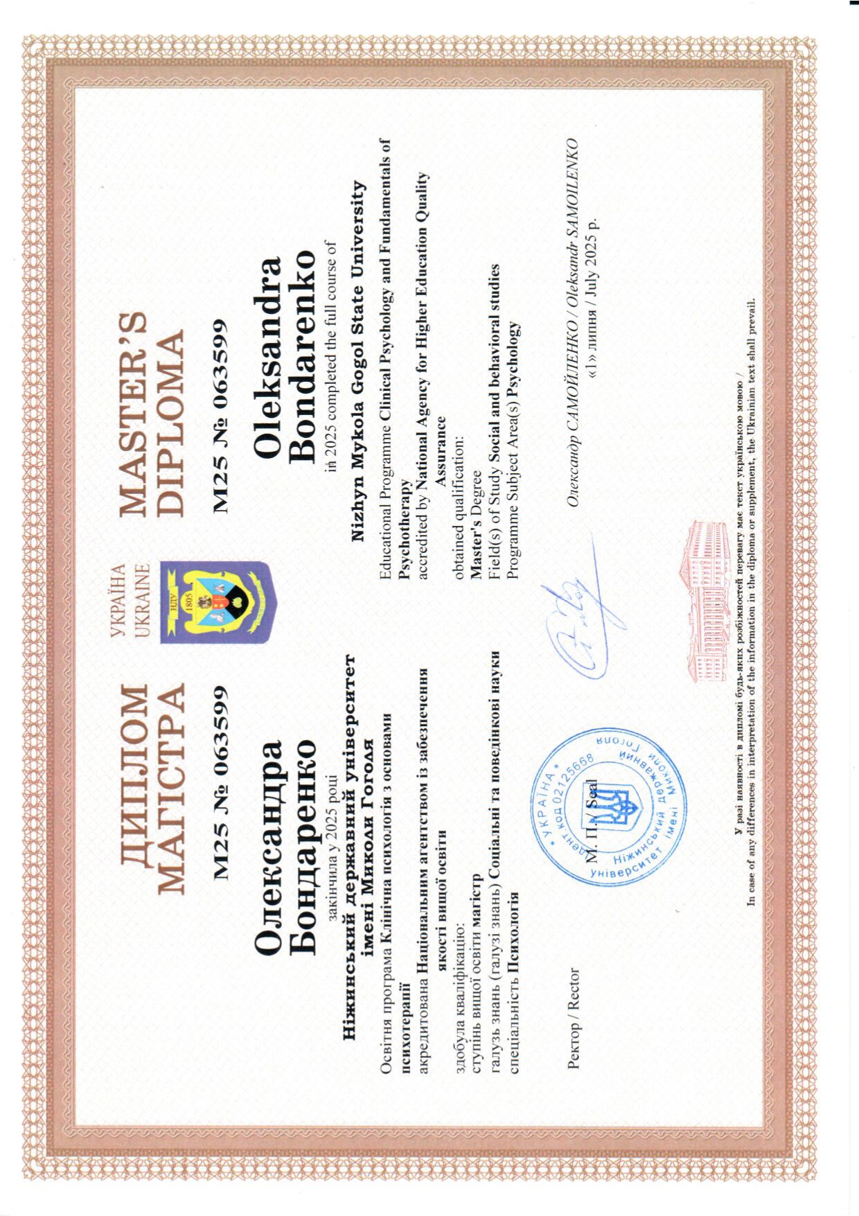 Ніжинський державний університет імені Миколи Гоголя, клінічна психологія з основами психотерапії, магістр.