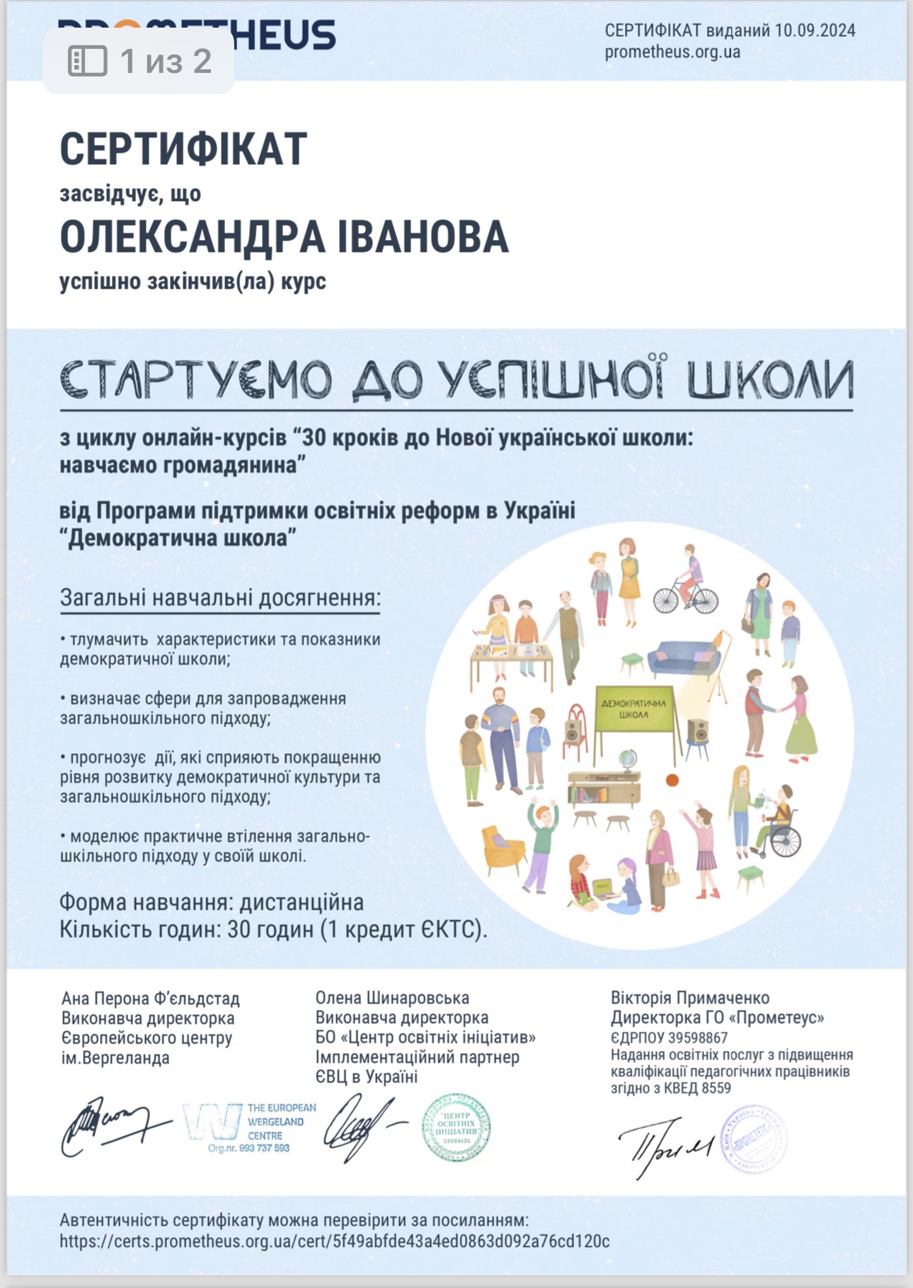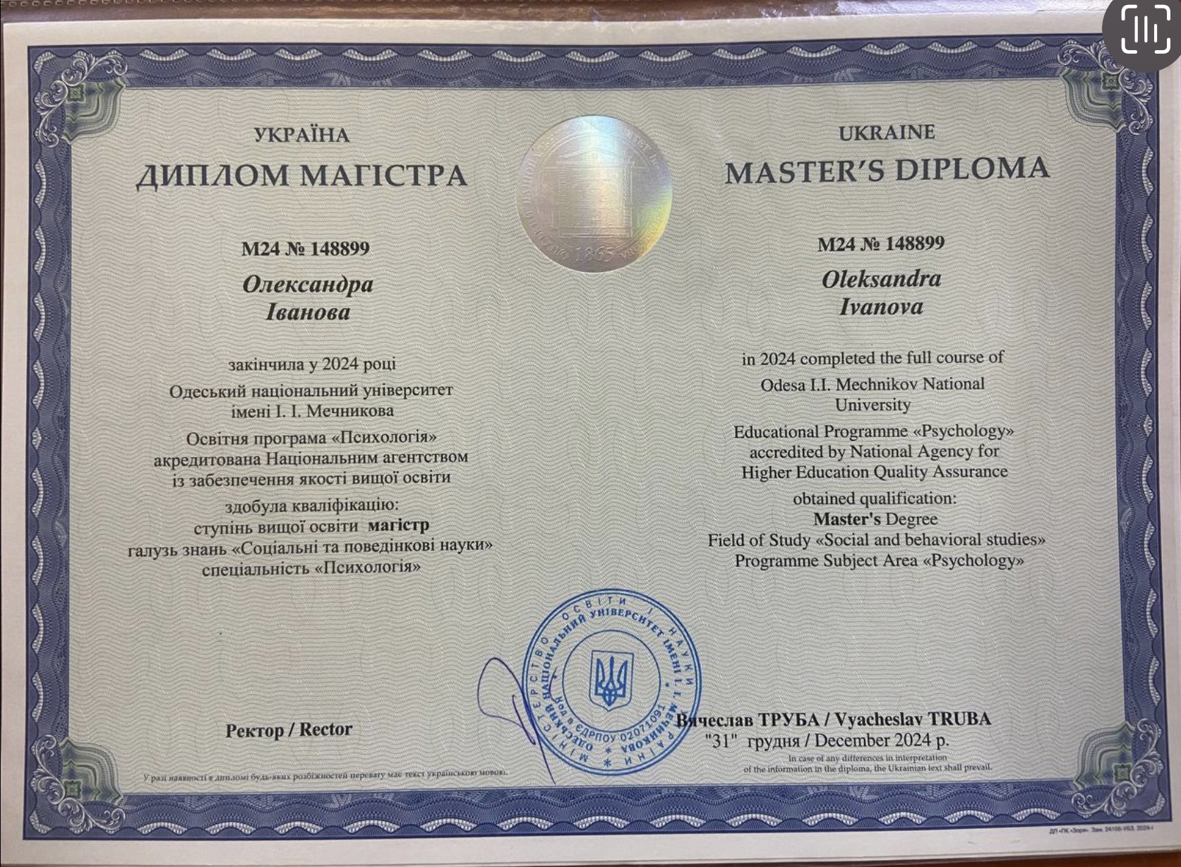 Регулярно підвищую кваліфікацію, відвідуючи тренінги та сертифікаційні програми з гештальт терапії, дитячої психології , маю супер візію.