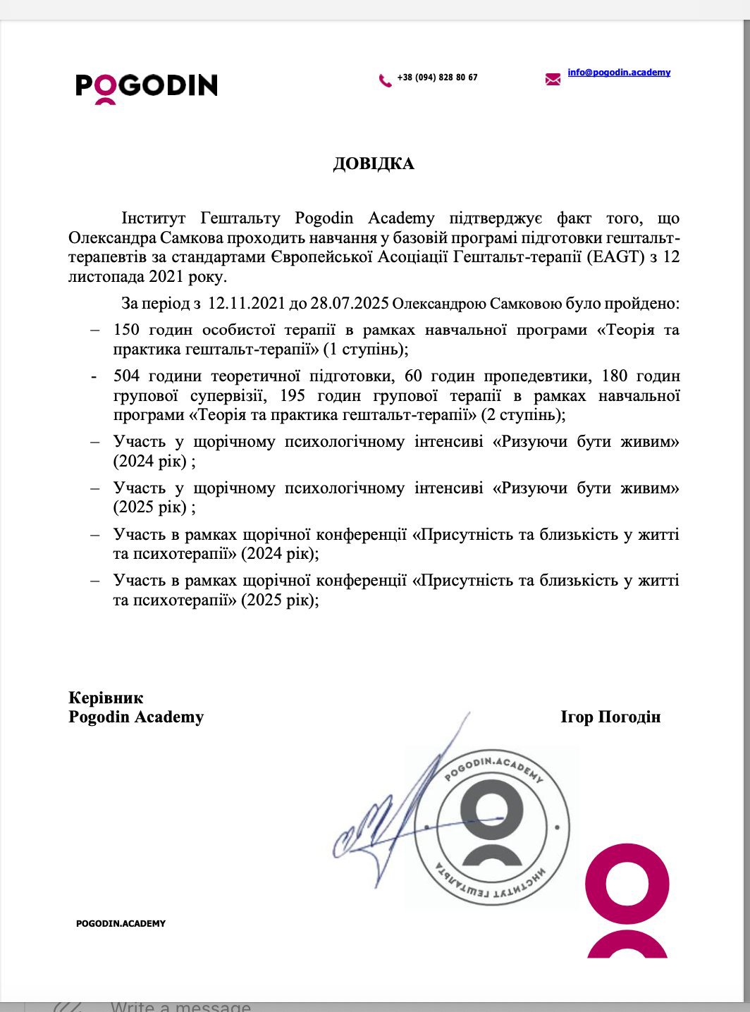 Сьогодні я працюю в методі гештальт-терапії. Це підхід, що допомагає повертати чутливість до себе, до моменту, до тіла, до емоцій. Він особливо корисний тим, хто звик ставити цілі, досягати результатів, але загубив себе в гонитві за успіхом. Тим, хто тривожиться, хто багато “тягне”, але рідко дозволяє собі слабкість і підтримку.