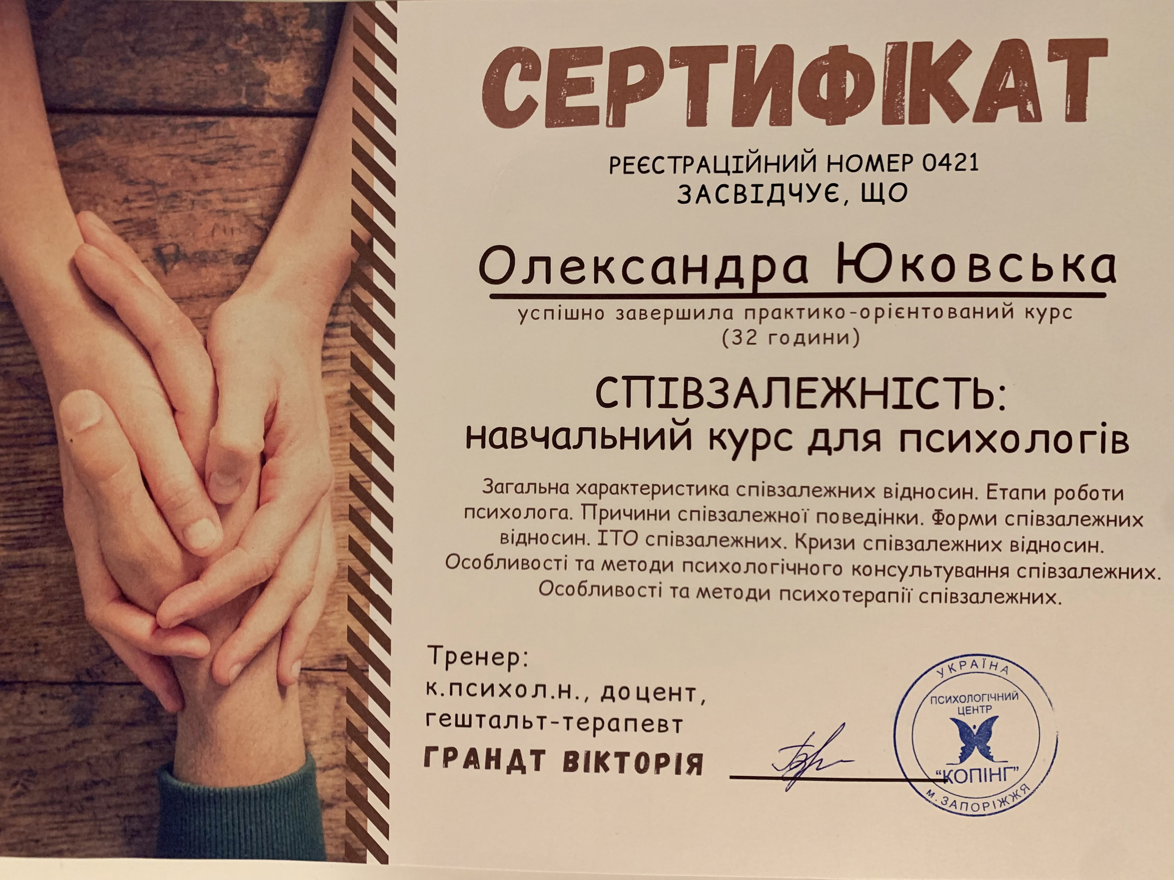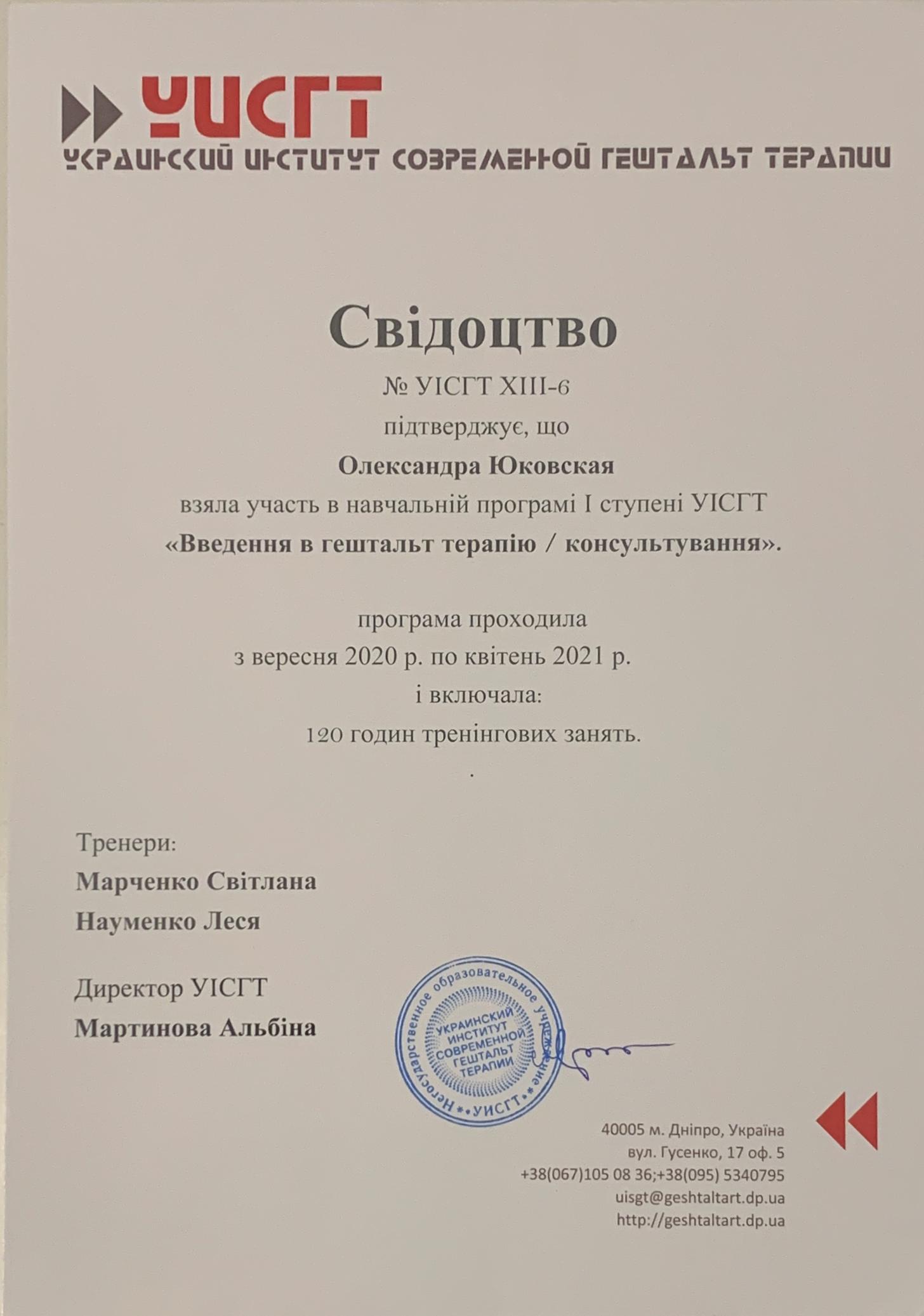 Зараза проходжу навчання на другій ступені гештальт терапії в Українському Інституті Сучасної Гештальт Терапії.