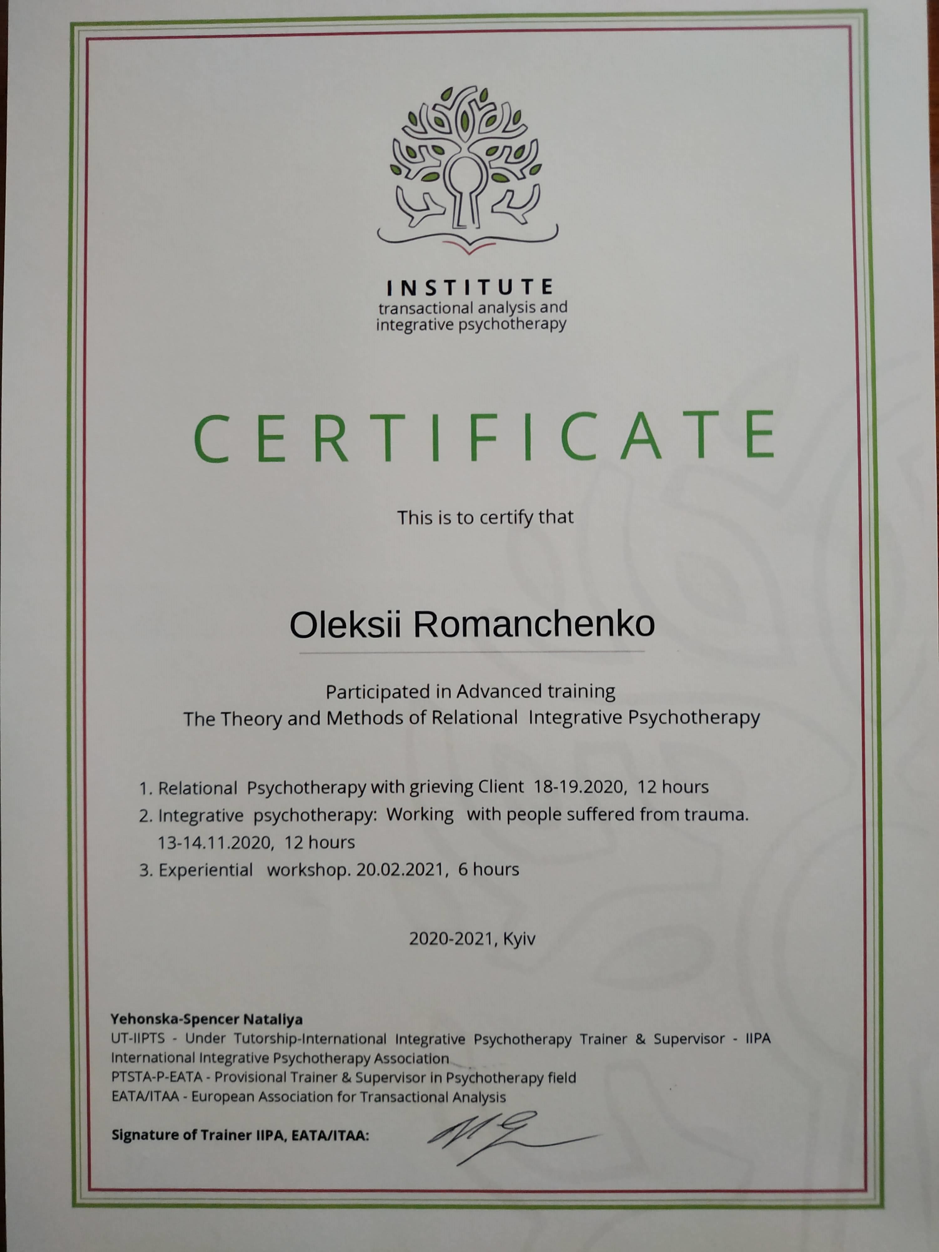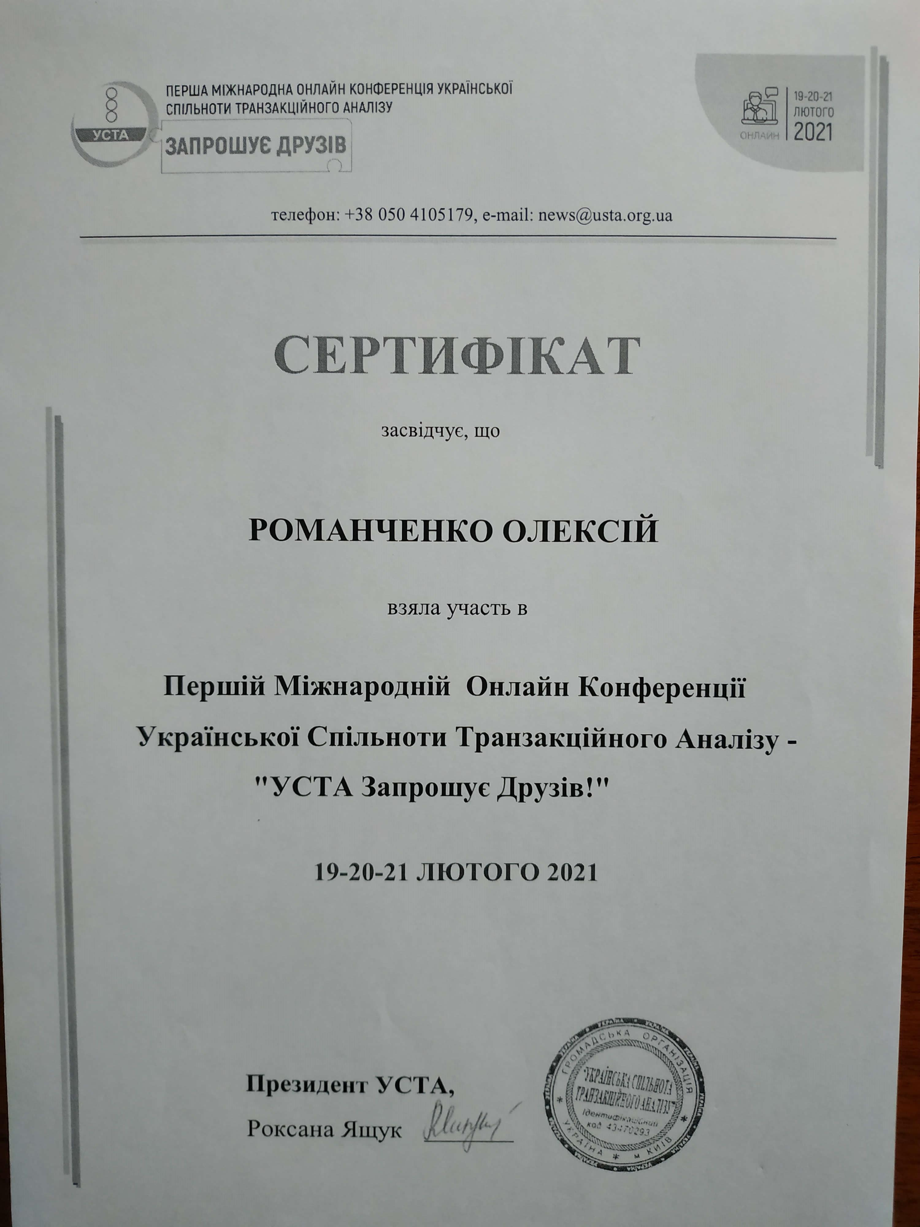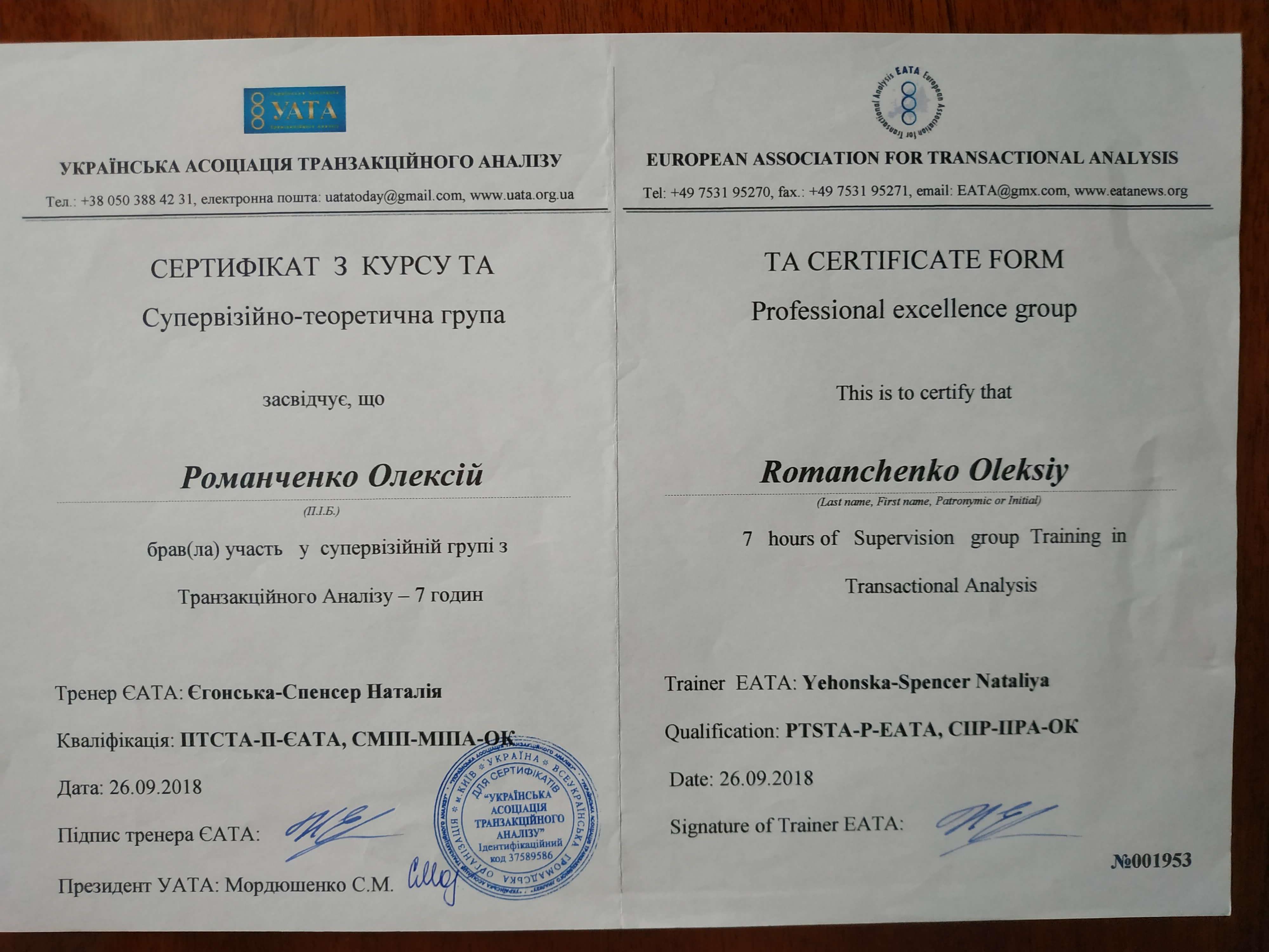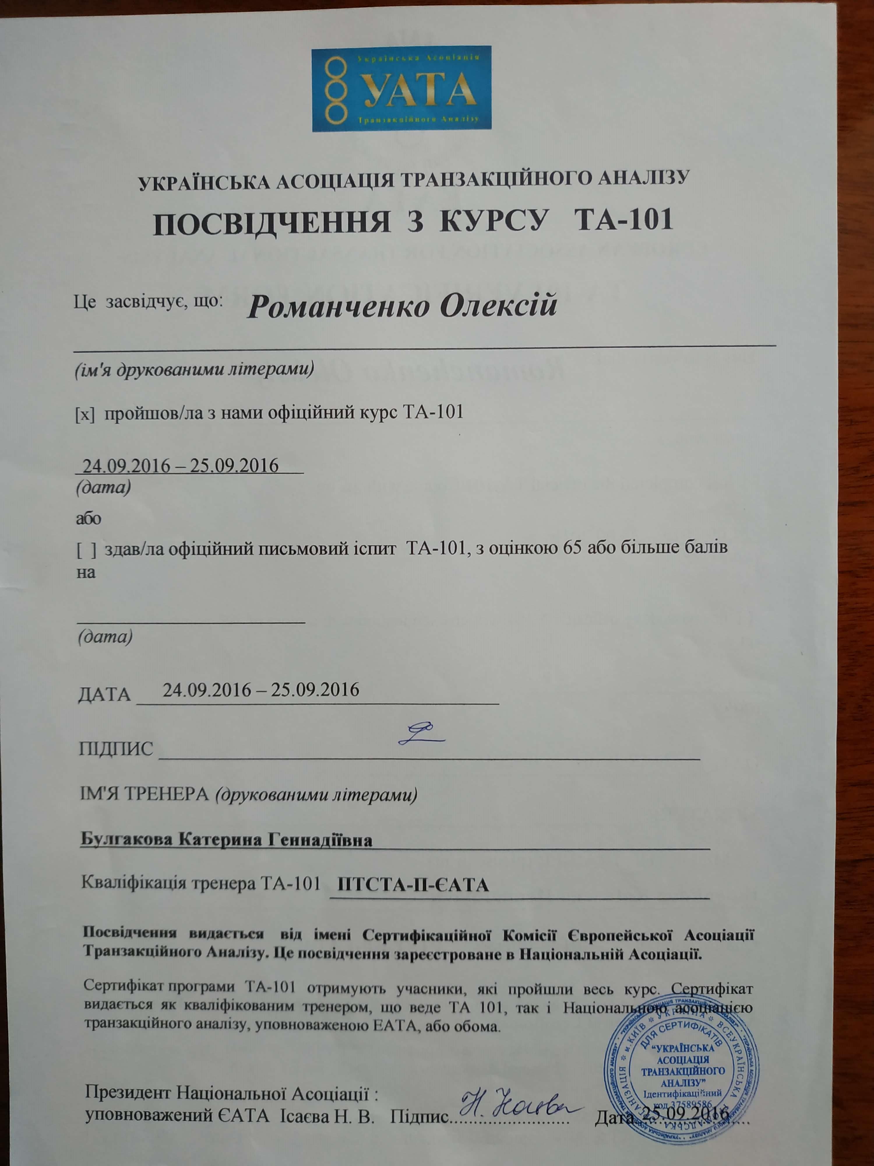 УАТА (Українська Асоціація Транзактного Аналізу) Навчання психологічного консультування та психотерапії у методі Транзактного Аналізу (101 курс, 202 курс) 360 годин;