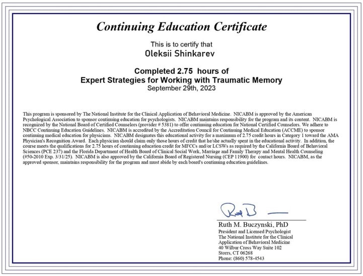 ✔️ The National Institute for the Clinical Application of Behavioral Medicine «Робота з травматичною пам'яттю».
