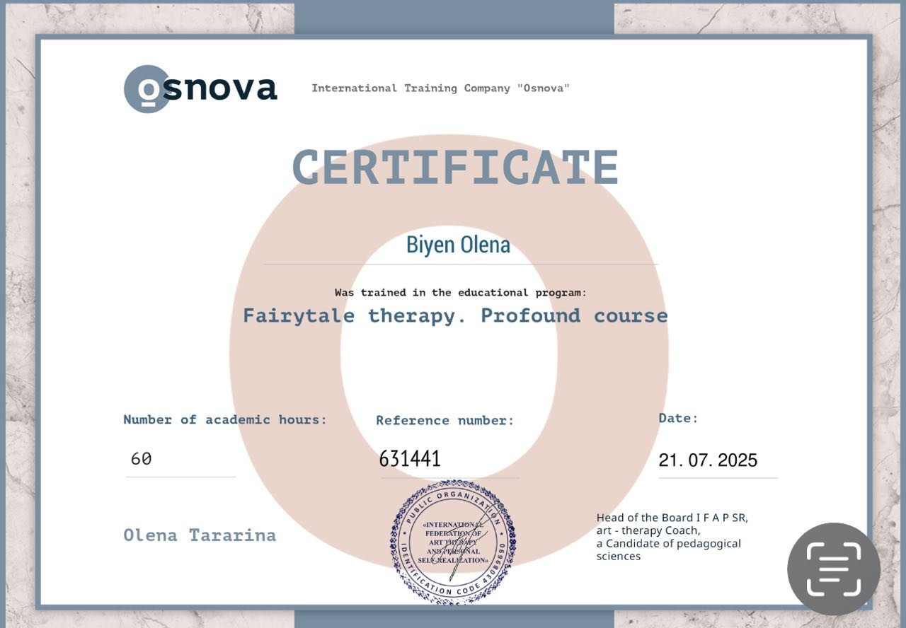Я пройшла великий шлях професійного навчання - від психологічної освіти до спеціалізацій у сфері травмотерапії, арт-терапії, казкотерапії, КПТ, роботи з дитячими травмами, емоційною регуляцією, стосунками та особистісним розвитком.