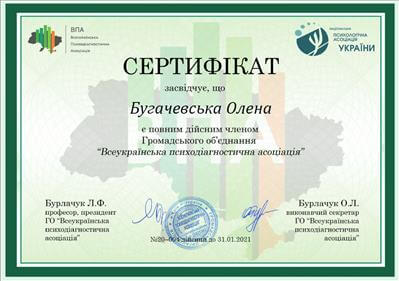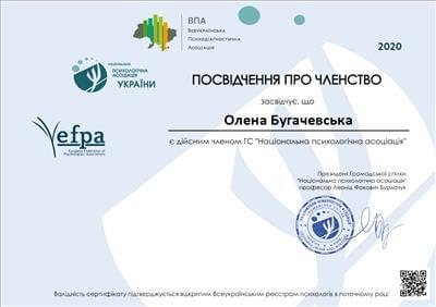 Я є членом таких асоціацій, як: Всеукраїнська психодіагностична асоціація; Національна психологічна асоціація України; Українська асоціація транзактного аналізу (УАТА); Європейська асоціація Транзактного аналізу (ЄАТА); Асоціація превентивної та антиейджинг медицини.