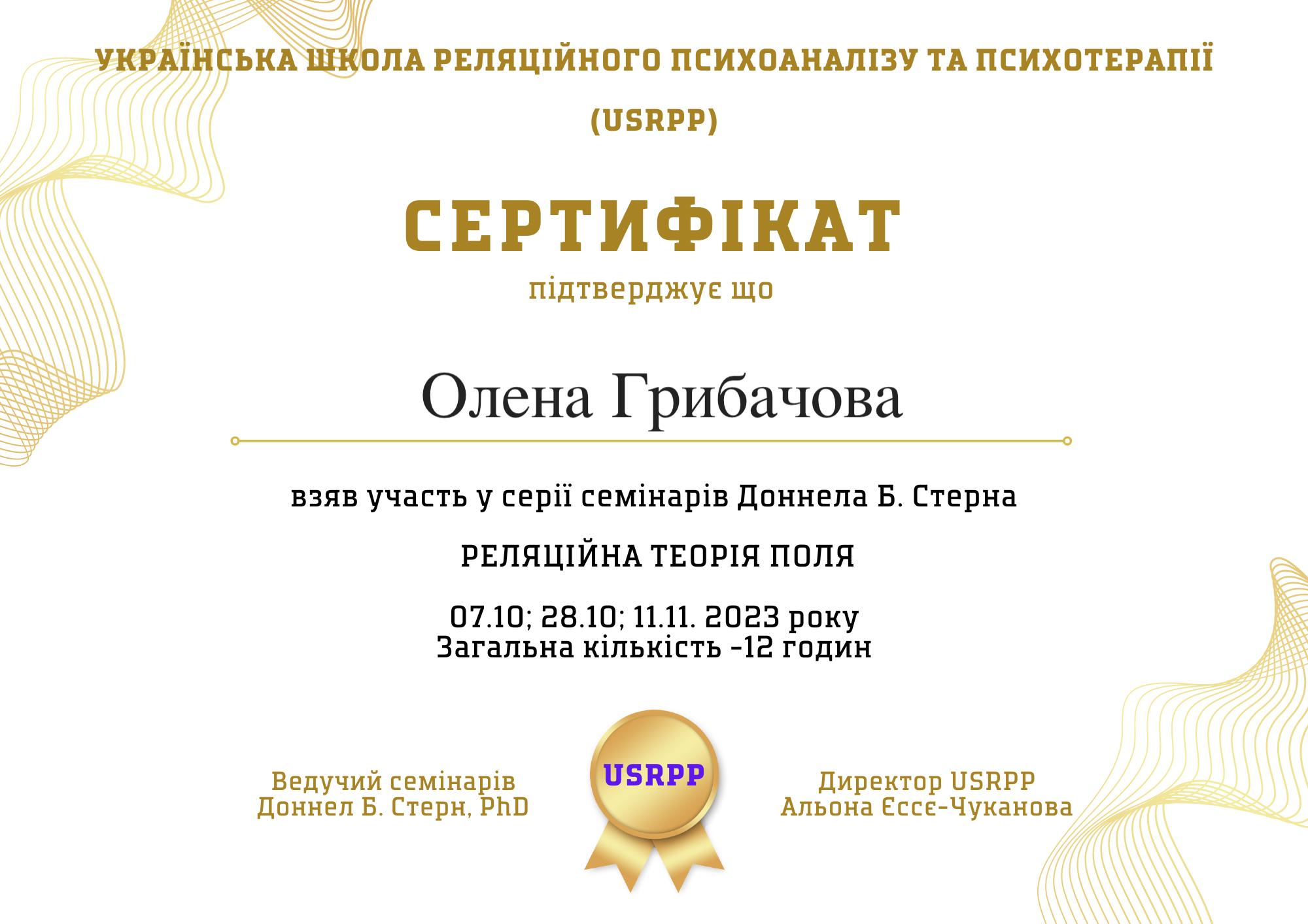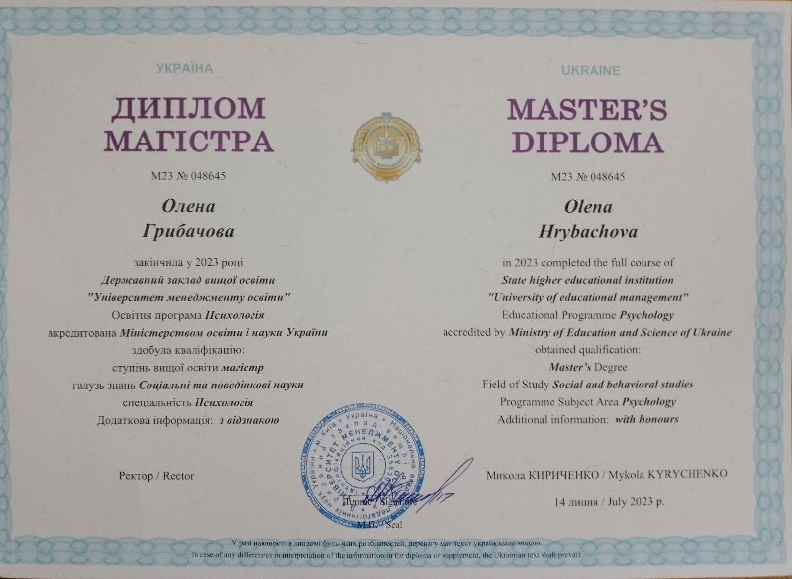 Університет менеджементу освіти, магістр психології 2021, Інститут консультування та психотерапії при Асоціації Психологів України 2019,