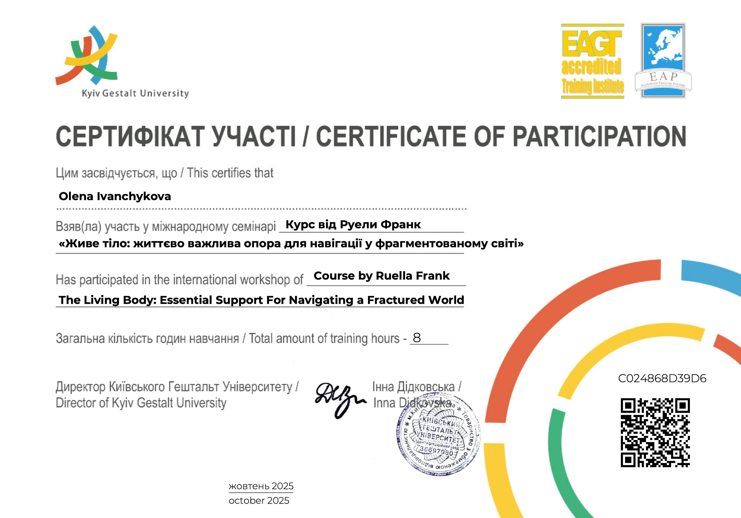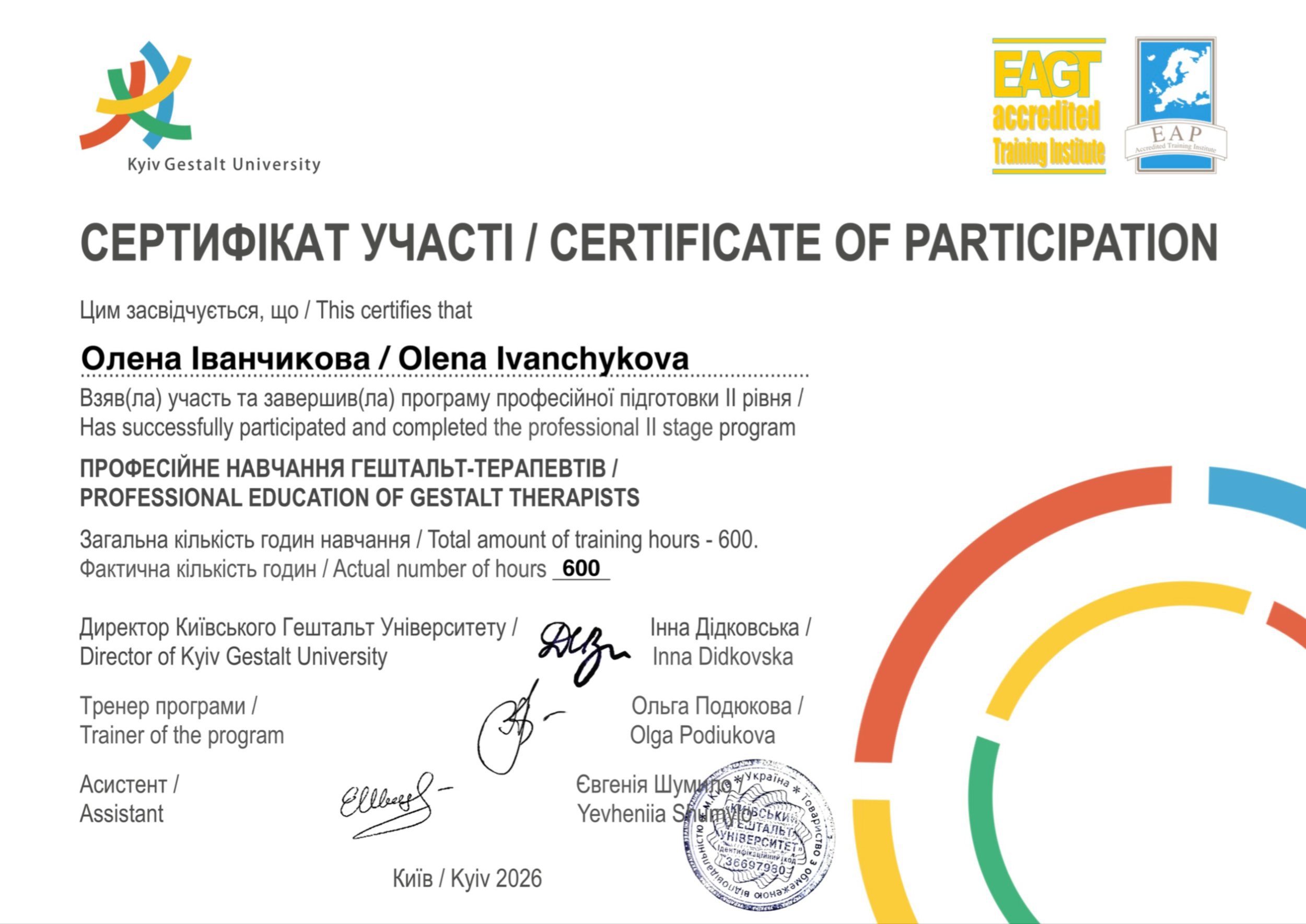 Професійне навчання гештальт-терапевтів, II ступінь у Київському Гештальт Університеті.