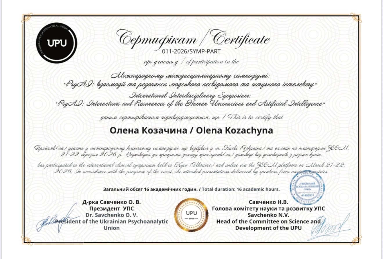 Підвищення кваліфікації «Мікропсихоаналіз: методи та інструменти. Міжнародна програма» (Московський Інститут Психоаналізу спільно з Італійським Інститутом Мікропсіхоаналізу, 2020р.)