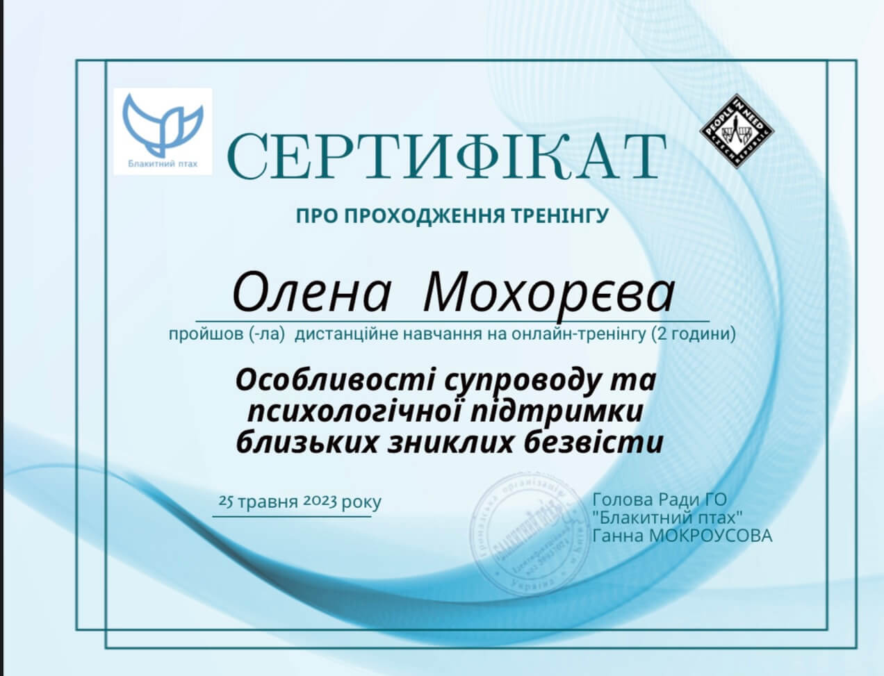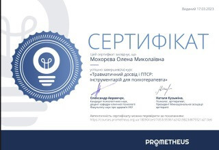 Маю багаторівневу підготовку та регулярно підвищую кваліфікацію у сфері психологічної допомоги дорослим і дітям, зокрема у роботі з травмою, втратою, тривожними станами, наслідками війни та кризовими переживаннями.
