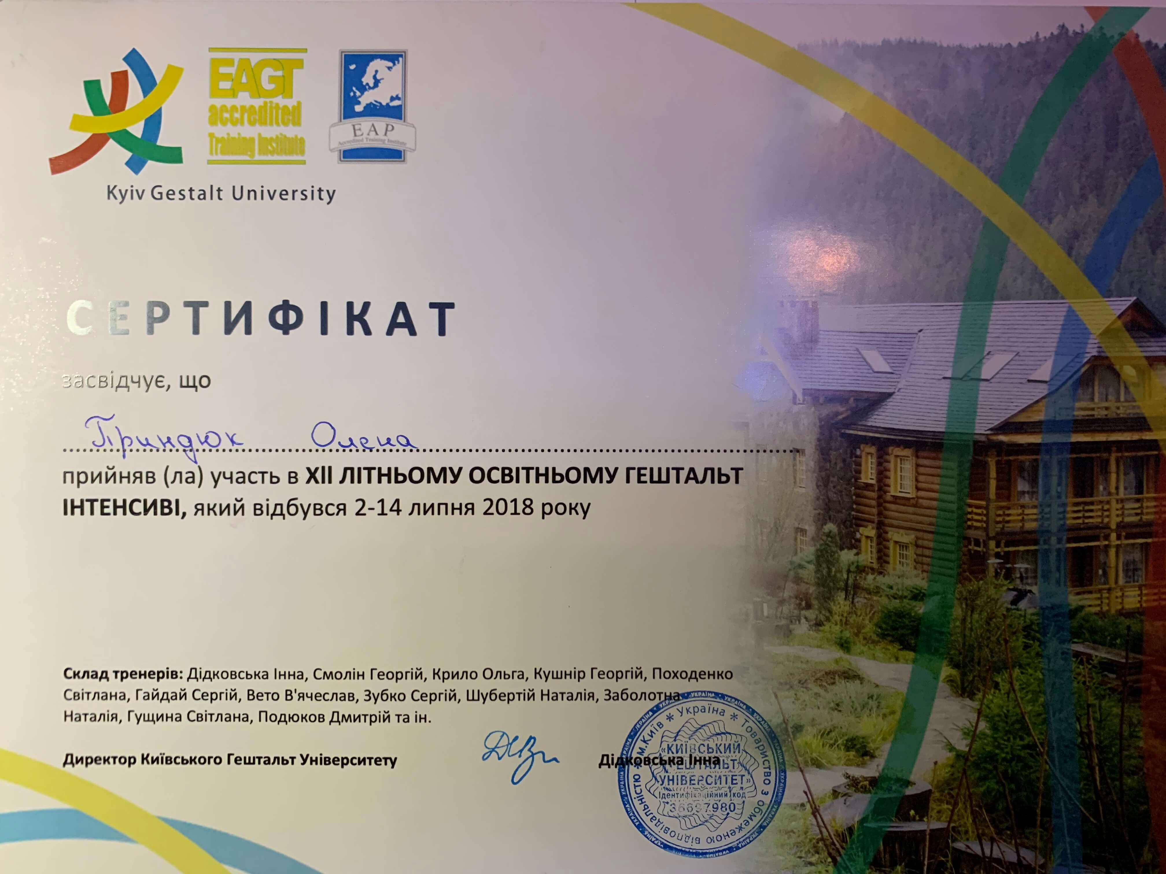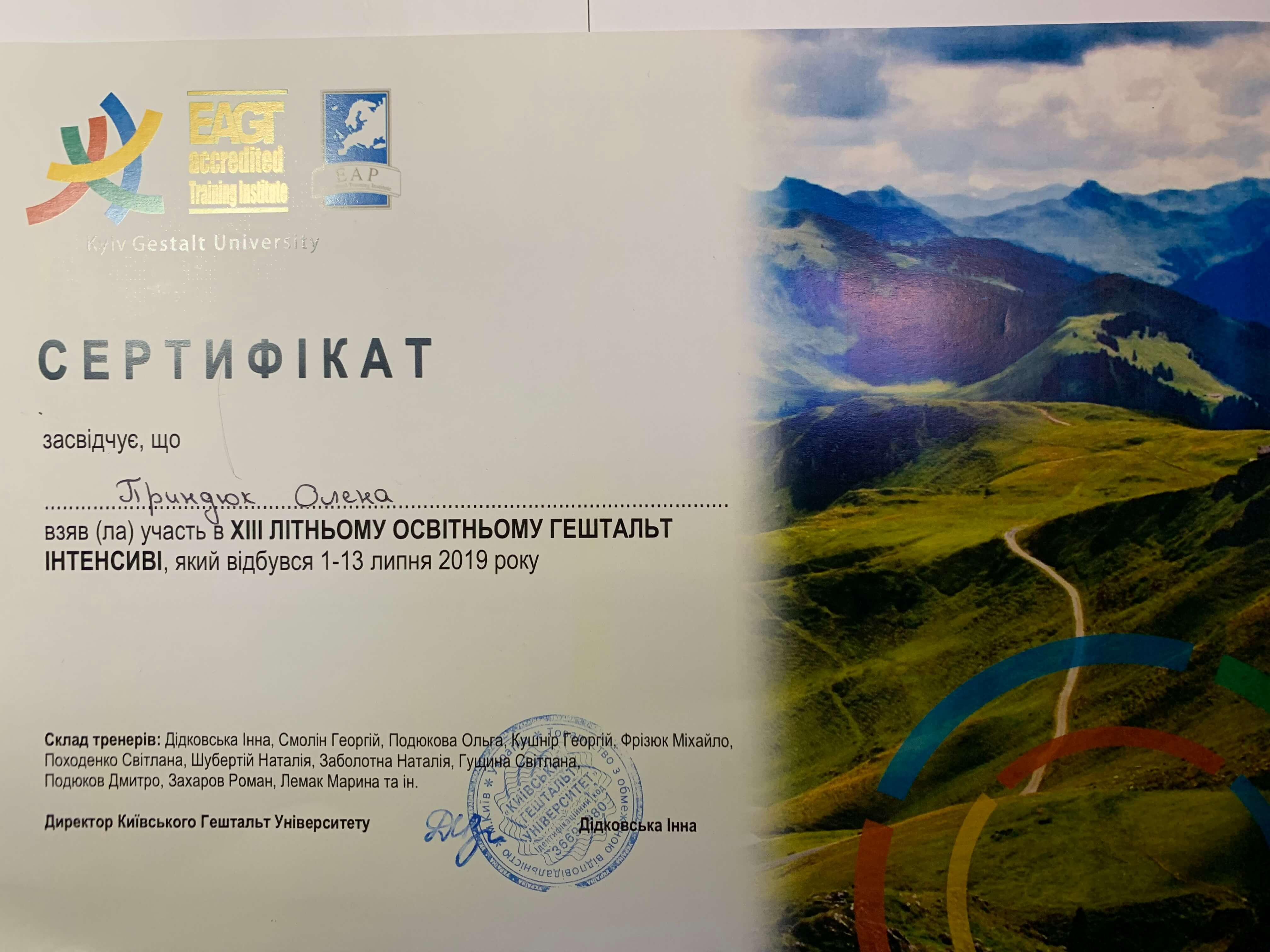 Дипломований психолог (магістр «Практичної психології та педагогіки» Київського Педагогічного Університету) та Гештальт-терапевт, Травмо-терапевт але насамперед – я Людина, Жінка та Мама 12-річних двійнят. Люблю життя і люблю жити тим життям, яким живу. Допитлива, багато навчаюсь і відкрита до спілкування. У роботі доброзичлива, підтримуюча, переношу себе в контакт із Клієнтом, дбайлива і чуйна, але залишаюся при цьому чесною, стійкою, прямолінійною та цілісною. Однією з цінних якостей, яку відзначають не лише Клієнти – бути включеною, уміння слухати та чути. Можу бути різною, але при цьому залишатися дбайливою з іншими. Теми, з якими готова працювати та працюю: - теми втрат, горювання, гострого горя; - травми насилля; - вимушена еміграція, як не втратити себе в чужій краіні; - емоційне вигоряння; - депресії; - кризи (особистісні, вікові, кар'єрні...); - теми відносин; - самооцінка; - робота з почуттями провини, сорому; - власні кордони, що це таке і як іх встановлювати, не порушуючи кордонів іншоі людини; - співзалежні відносини; - цікава тема сновидінь; - робота з сім'ями та парами; - робота із сімейною системою через одну людину; - робота із тілом. Ведуча терапевтичних та навчальних груп. Приймала участь в інтенсивних, конференціях, циклах лекцій, вебінарів і т.д. Є учасницею терапевтичної, супервізорської та інтервізорської груп. Проводжу психологічну трансформаційну гру «Шлях до Мрії» та фінансову гру «CashFlow». Психолог у міжнародному благодійному проекті "Rotary Club Kyiv International" Навчання фінансової грамотності підлітків. Працюю під супервізією та проходжу особисту терапію.
