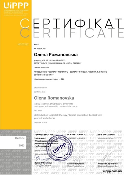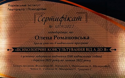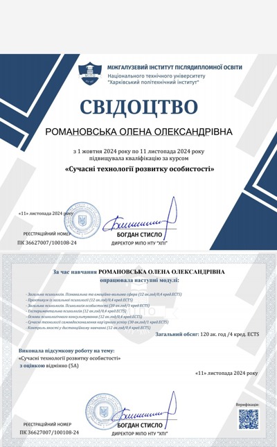 Я – психолог, для якого професія є не лише роботою, а й покликанням. який поєднує в собі любов до людей, щирий інтерес до світу та глибокий професійний підхід. У житті мене надихають діти, тварини, квіти, подорожі, мистецтво й кіно. Я ціную красу у всіх її проявах та постійно відкриваю для себе нове: будь то навчання, медитації чи нові методики в психології. Моє кредо – ніколи не зупинятися у розвитку, бо саме так можна допомагати іншим ще більш ефективно.Зараз пішла підвищувати кваліфікацію - на Клінічну спихологію – 900 годин. Понад 20 років я працюю у сфері психології та педагогіки. Я – кандидат педагогічних наук, доцент, викладач університету на кафедрі психології, де готую майбутніх фахівців. Викладаю такі дисципліни, як: