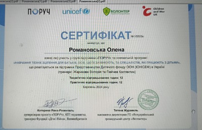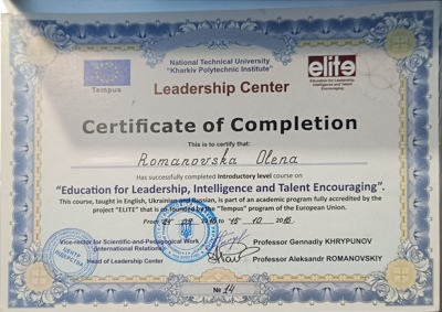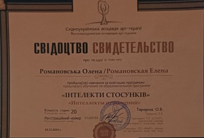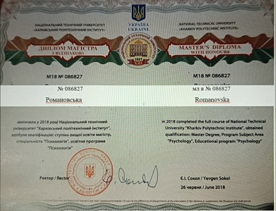 Український інститут прикладної психології та психотерапіїх- Гештальт, 1 ступень, Харківський інститут гештальта та психодрами - Психологічне консультування 1 рік навчання, НТУ " ХПІ" - магістр психології, психологічний центр розвитку особистості Адвансел- МАК, Східноукраїнська асоціація арт терапіїї- Інтелект стосунків