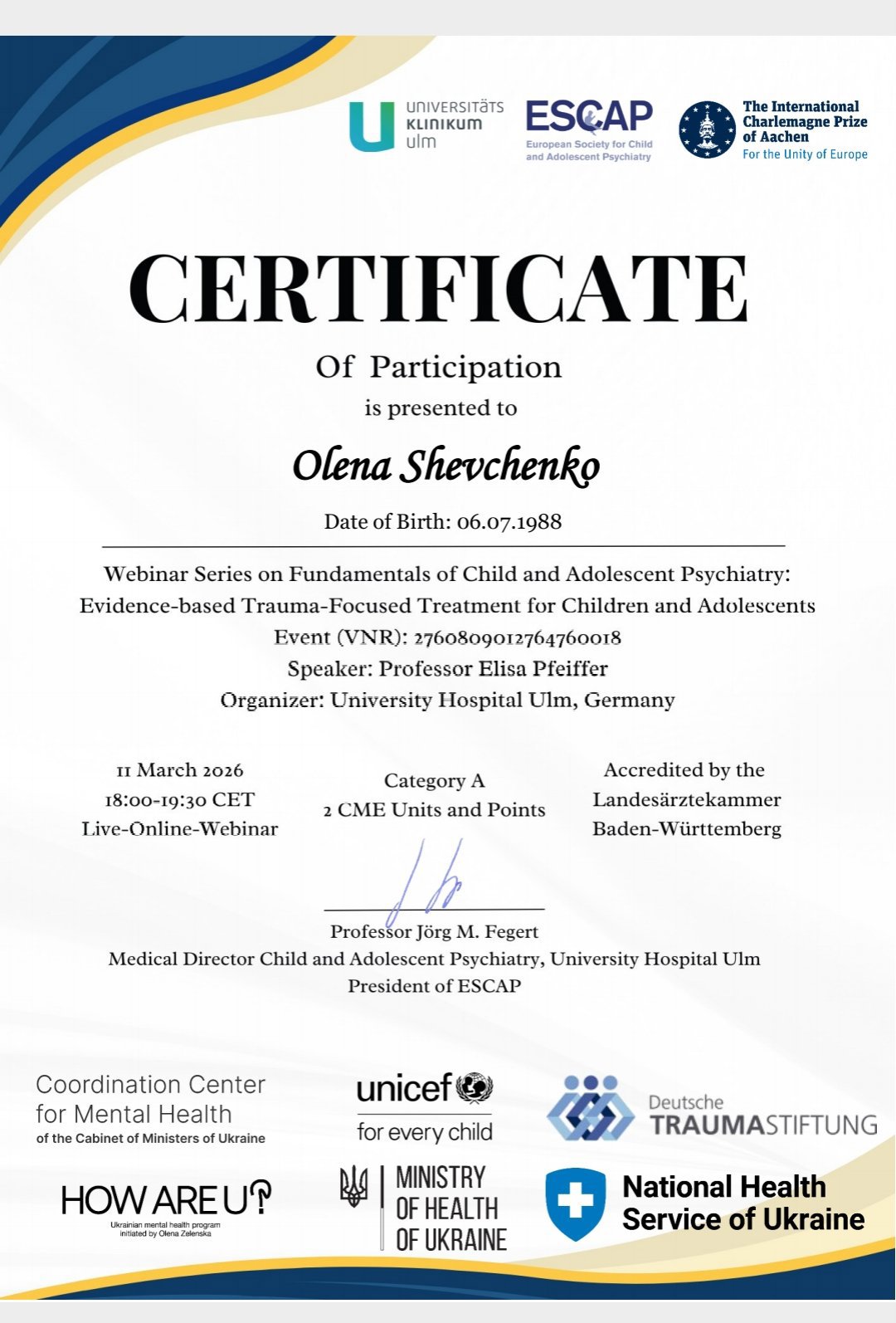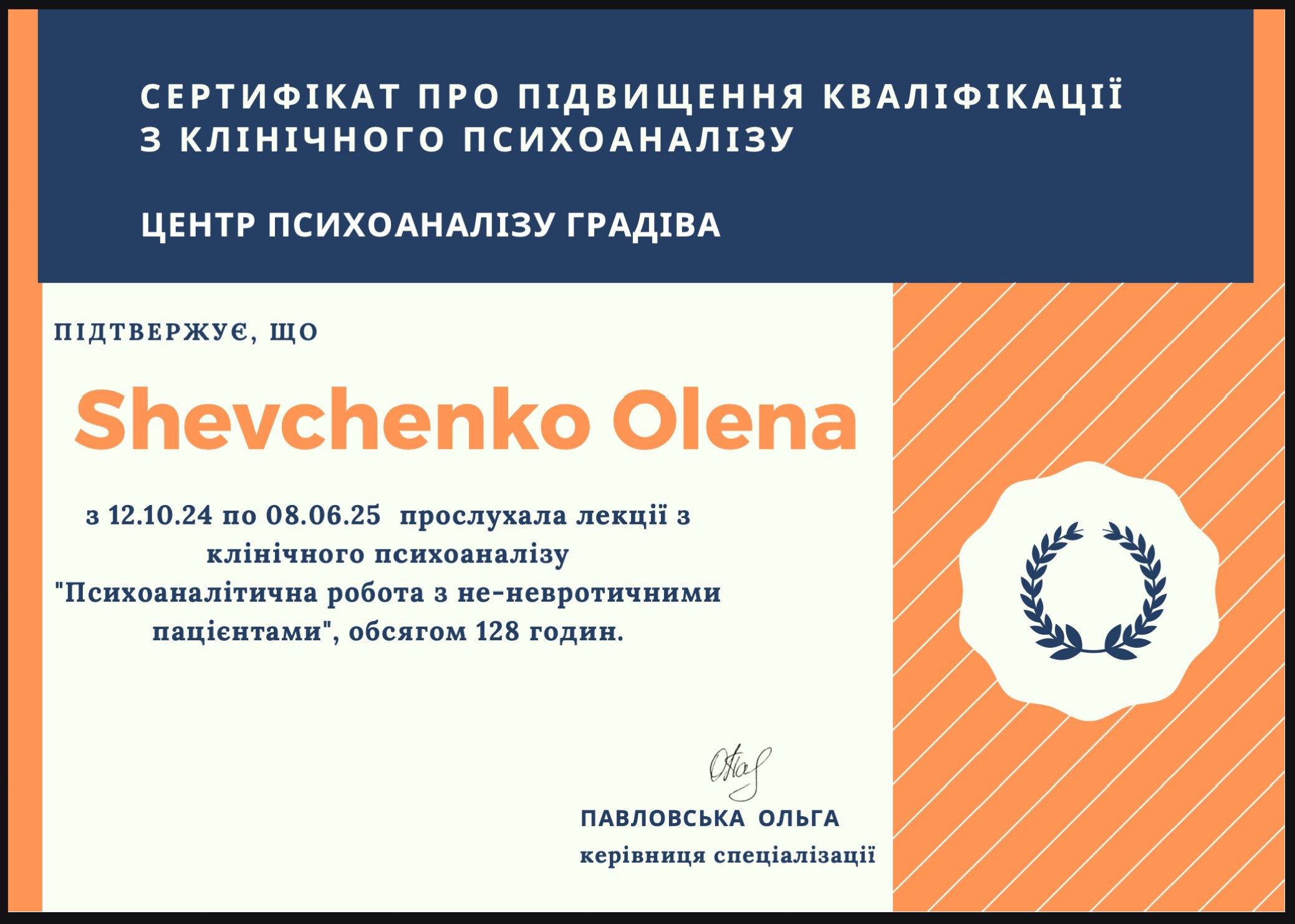 СЕРТИФІКАТ ПРО ПІДВИЩЕННЯ КВАЛІФІКАЦІЇ З КЛІНІЧНОГО ПСИХОАНАЛІЗУ