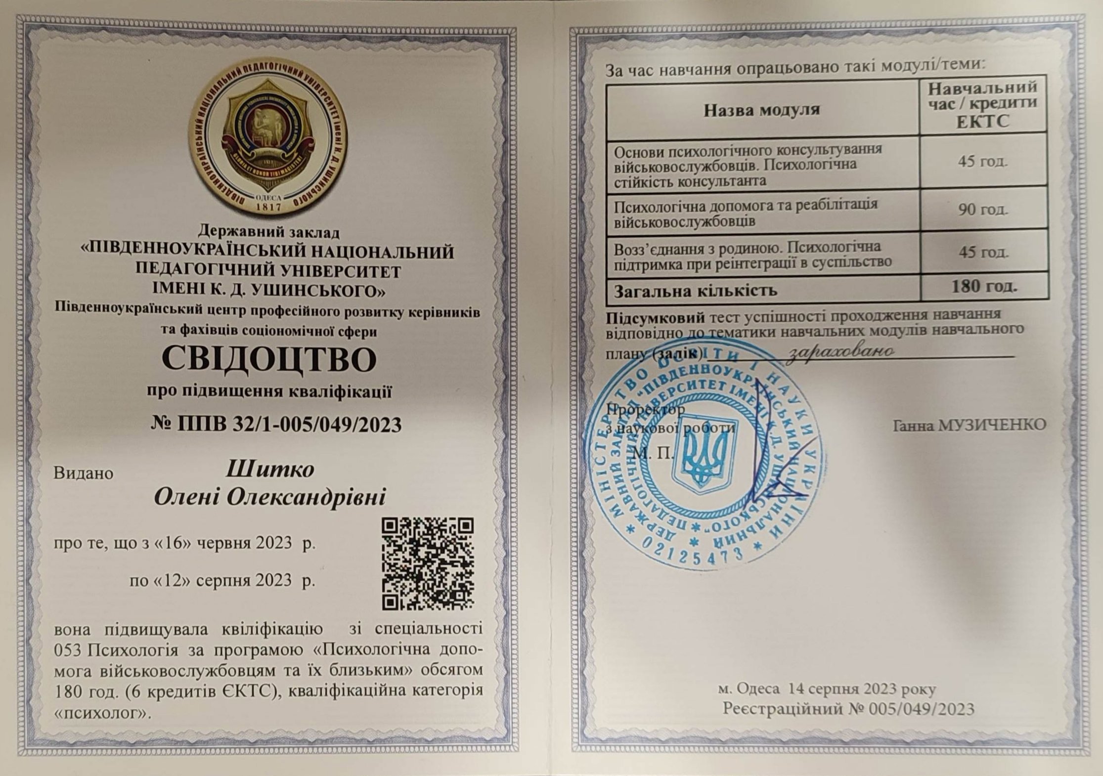 2023 рік Психологічна допомога військовослужбовцям та їх близьким 180 год (Південноукраїнський національний педагогічний університет ім. К.Д. Ушинського)