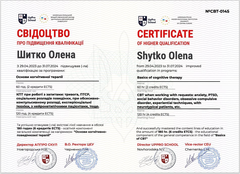 педагогічний інститут та отримала кваліфікацію бакалавр “Практичний психолог та психолог в закладах освіти”