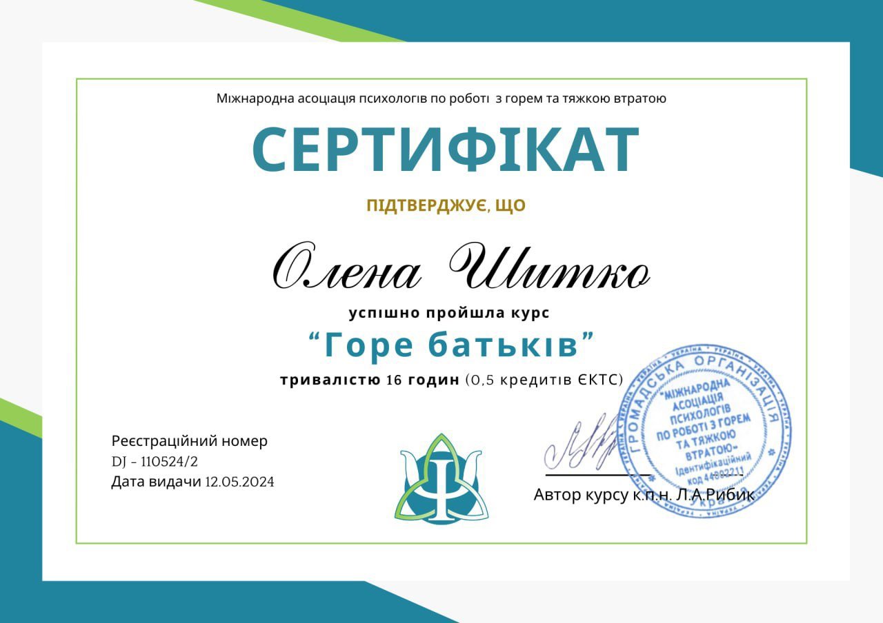 2023 рік Психологічний супровід людини при переживанні горя та втрати 52 год.(Міжнародна асоціація психологів по роботі з горем та тяжкою втратою)