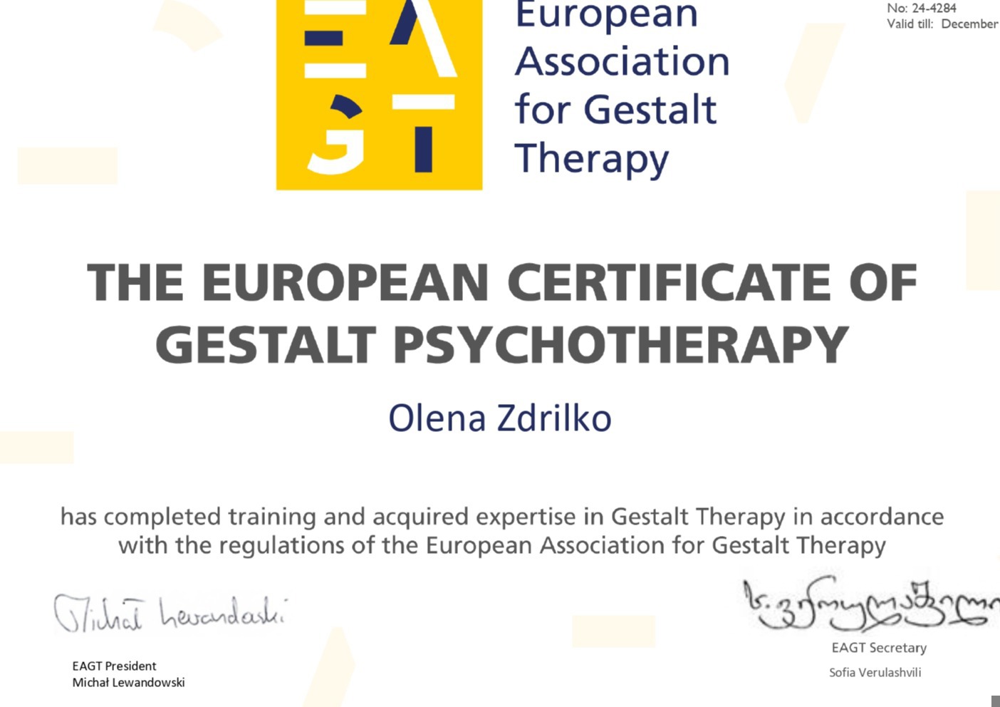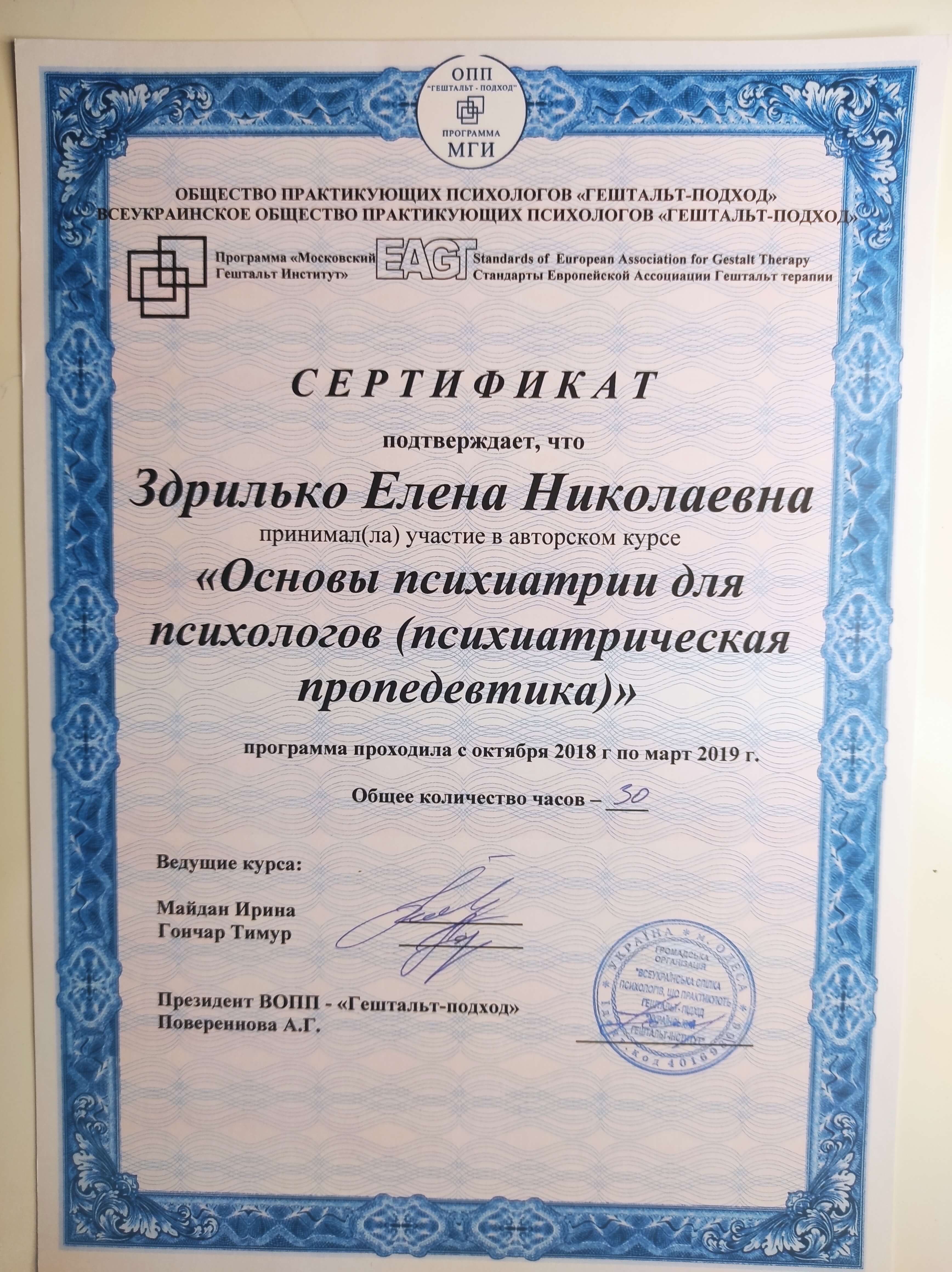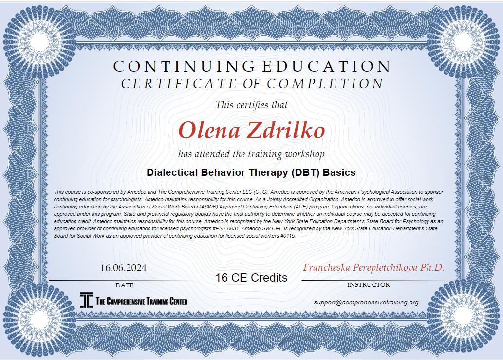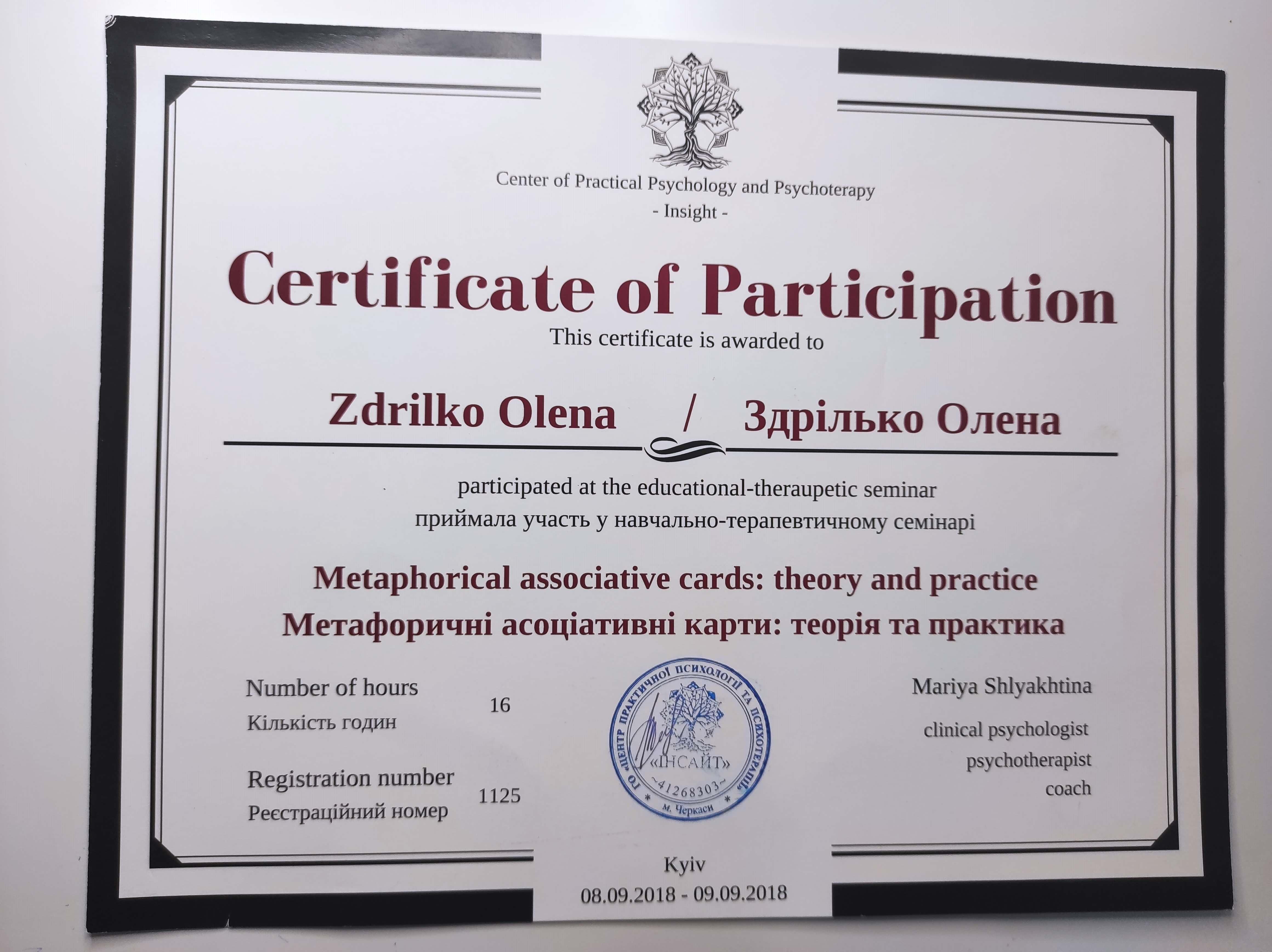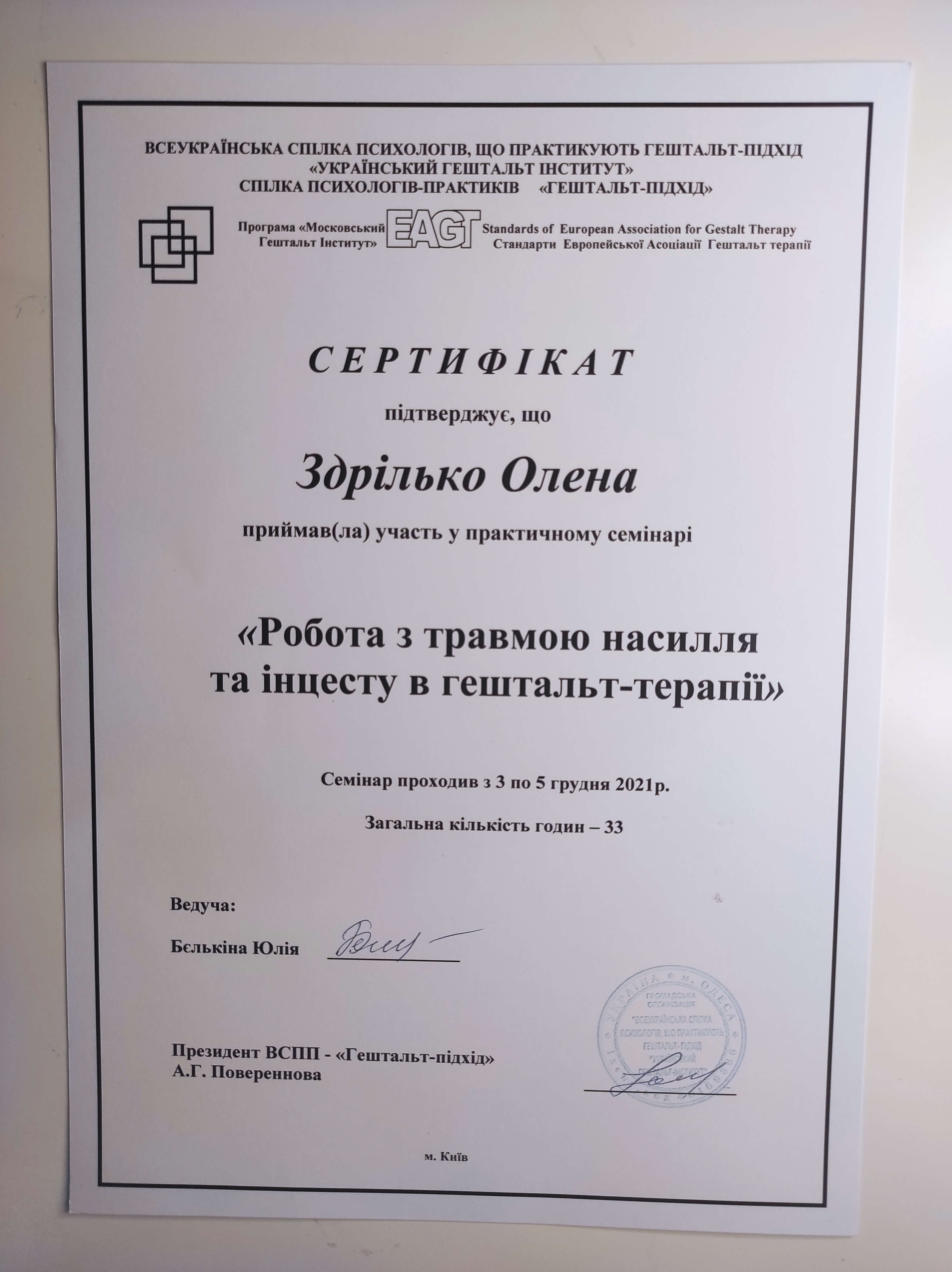 Акредитована гештальт терапевтка в НАГТУ та EAGT.