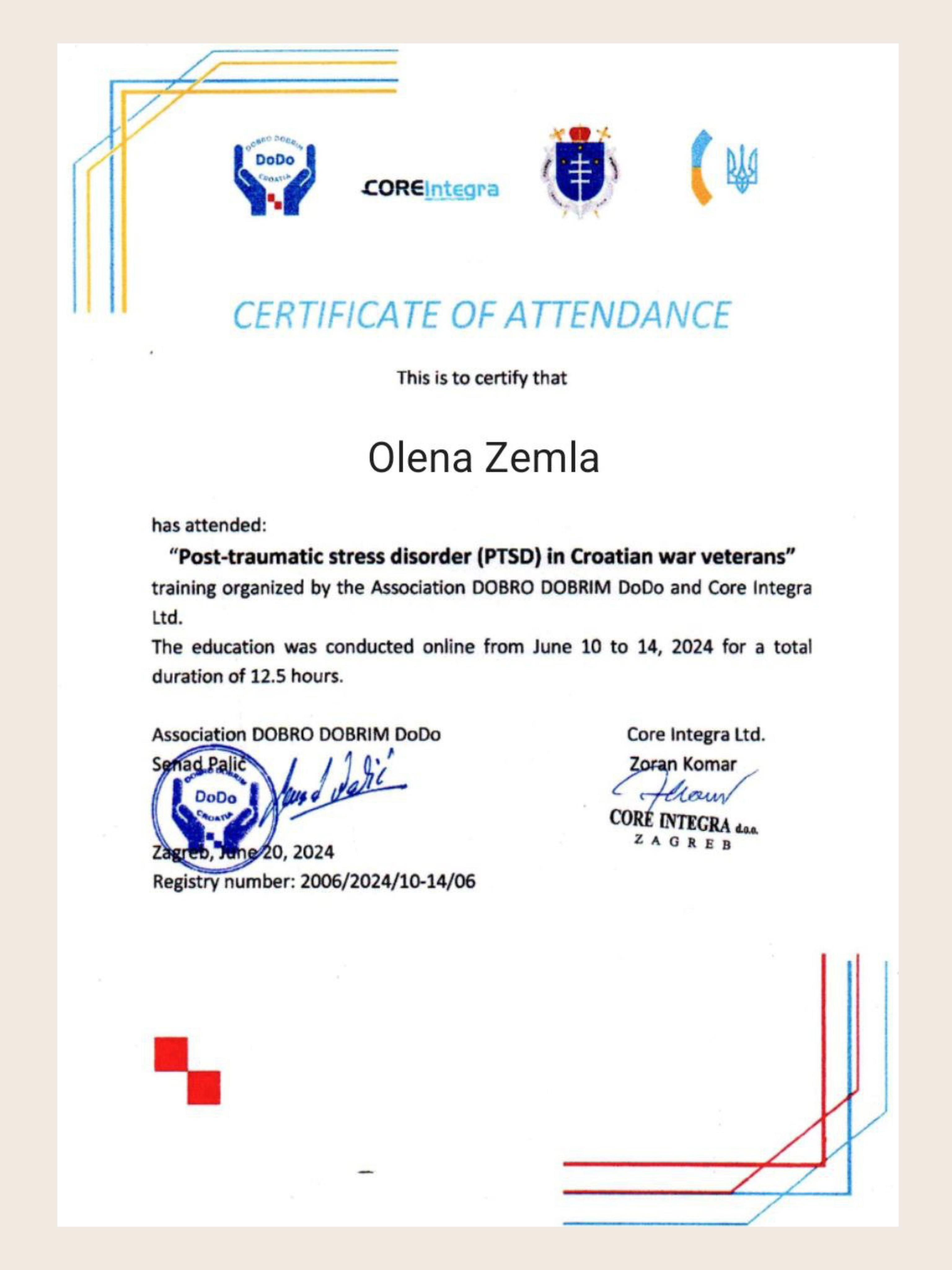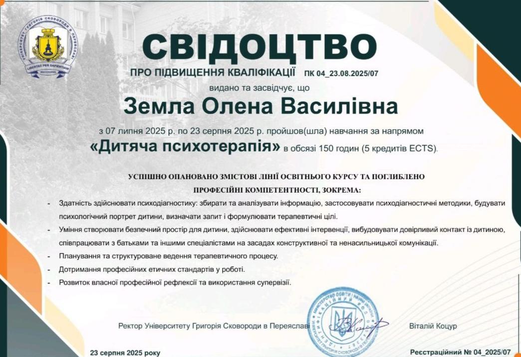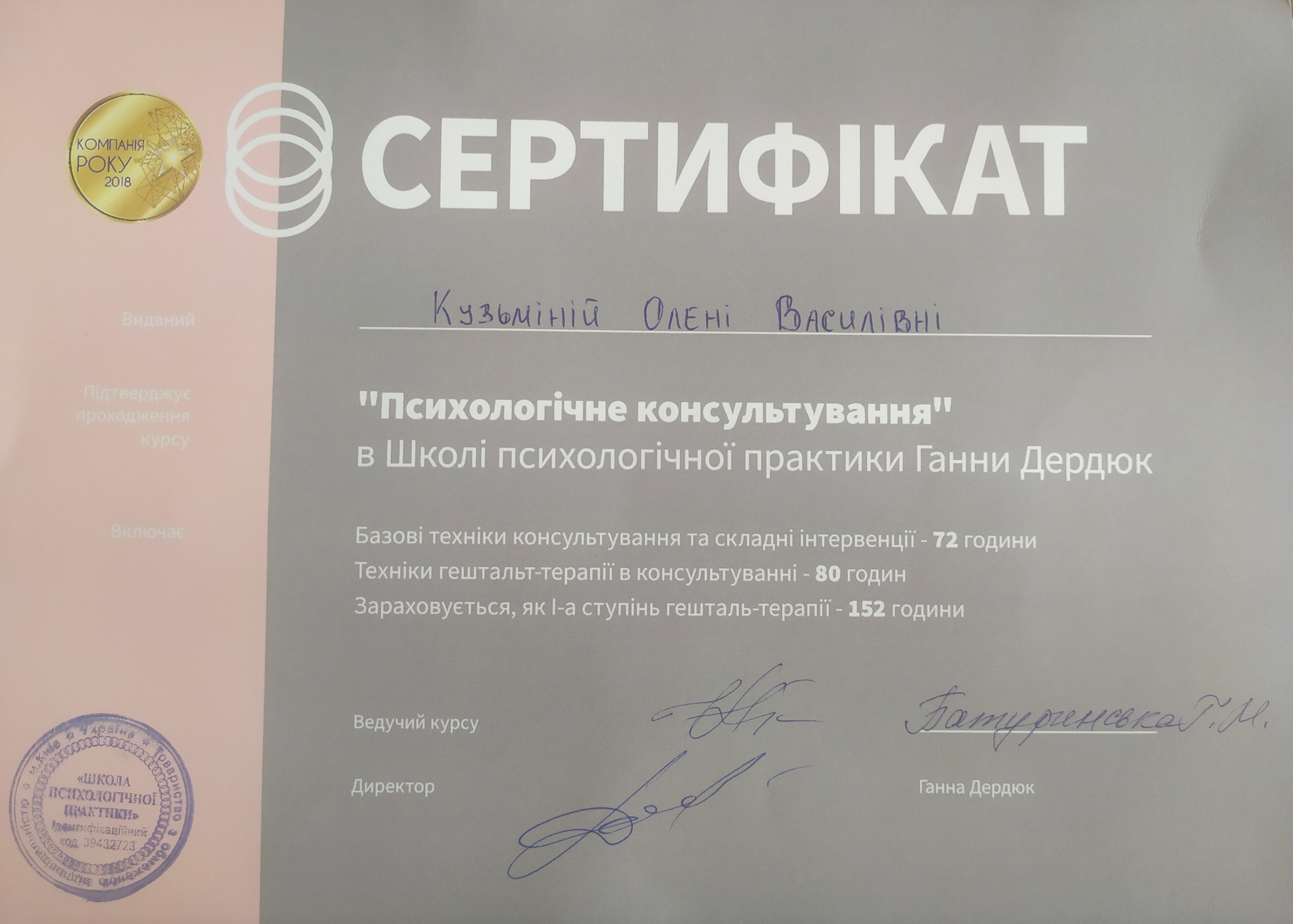 Закінчила курс "Психологічне консультування" та "Психокорекція в гештальт підході" в Школі психологічної практики (м. Київ), Курс "Вступ в схема-терапію" (м. Вроцлав), Курс "Методи арт-терапії в роботі з дітьми та підлітками". Наразі проходжу спеціалізацію з "Сімейної терапії та терапії пар" в Школі психологічної практики та "Дитяча психотерапія" на базі університету Григорія Сковороди.