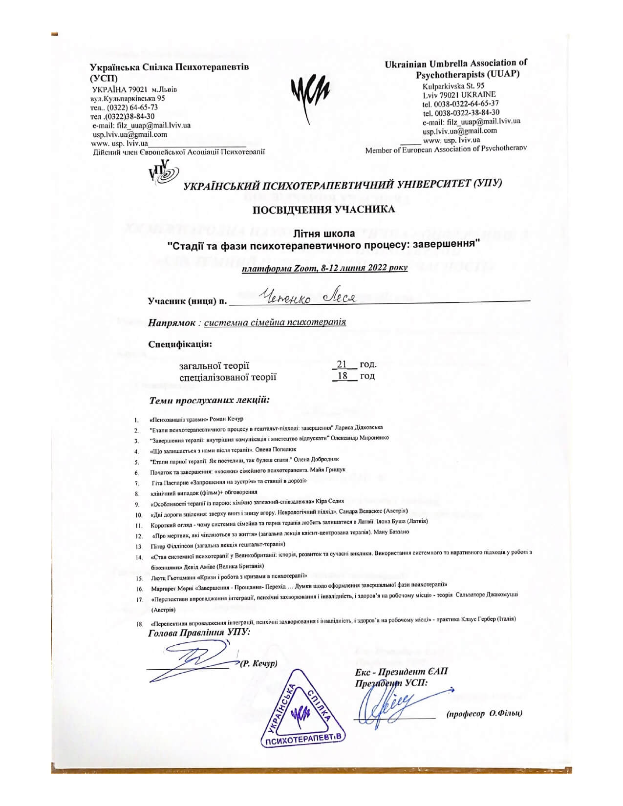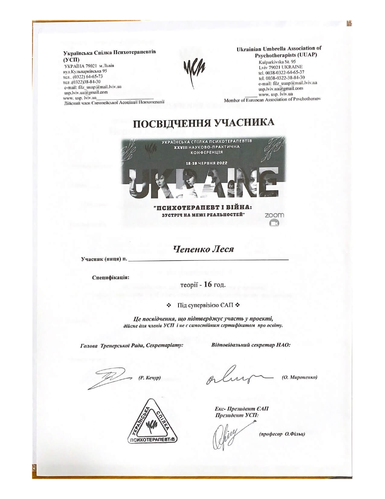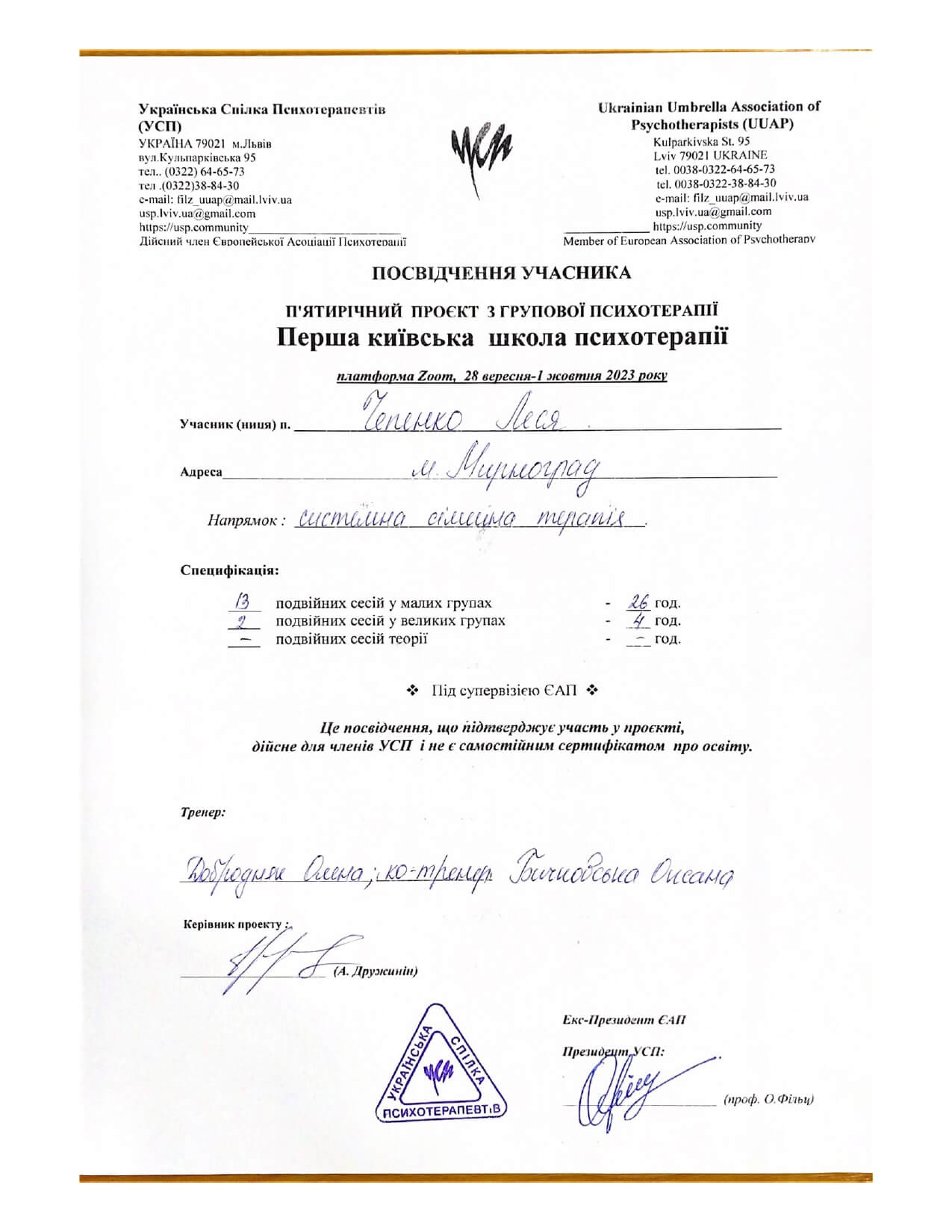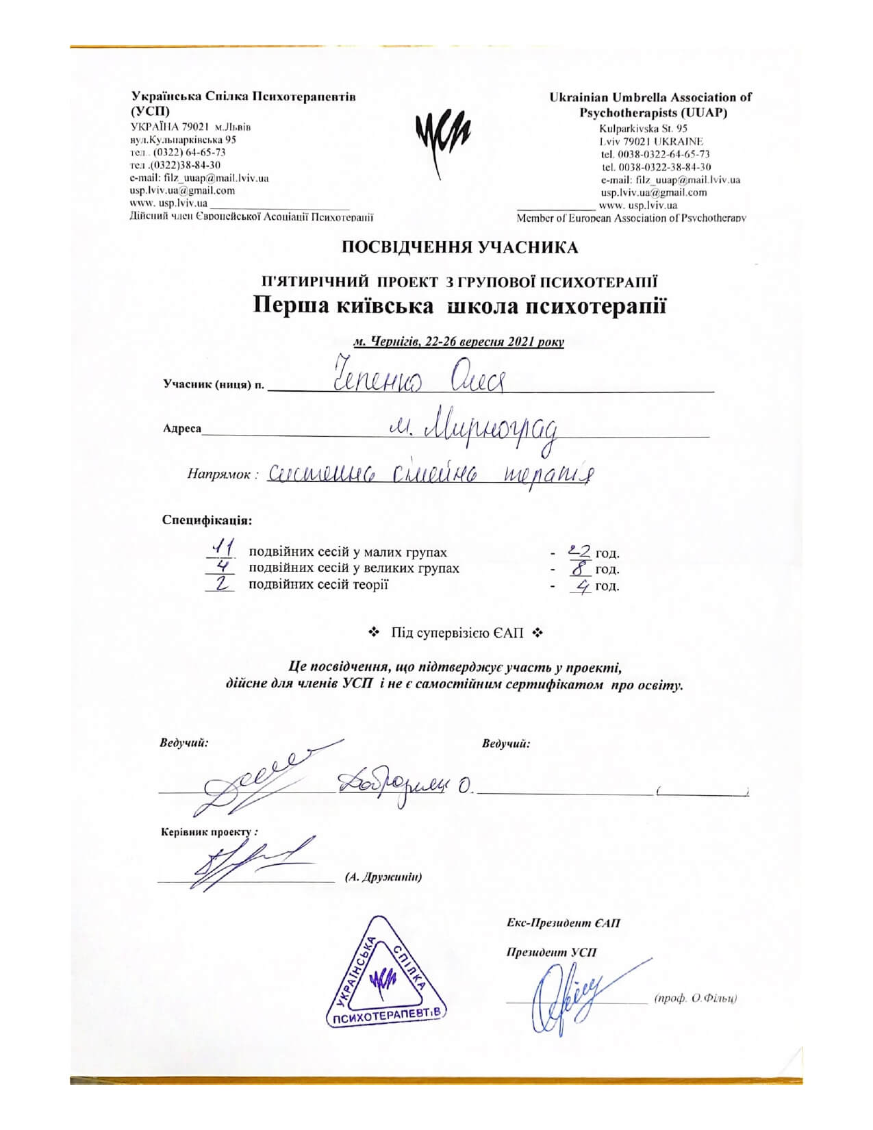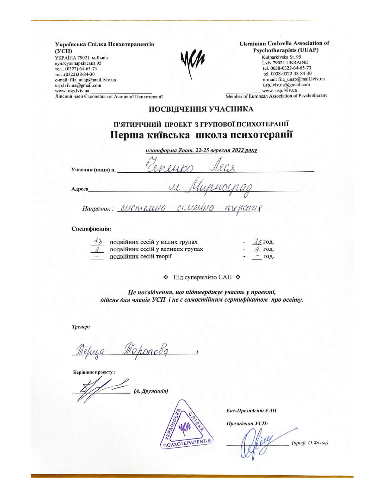З 2022 року проходжу навчання в Українському психотерапевтичному університеті (УПУ)