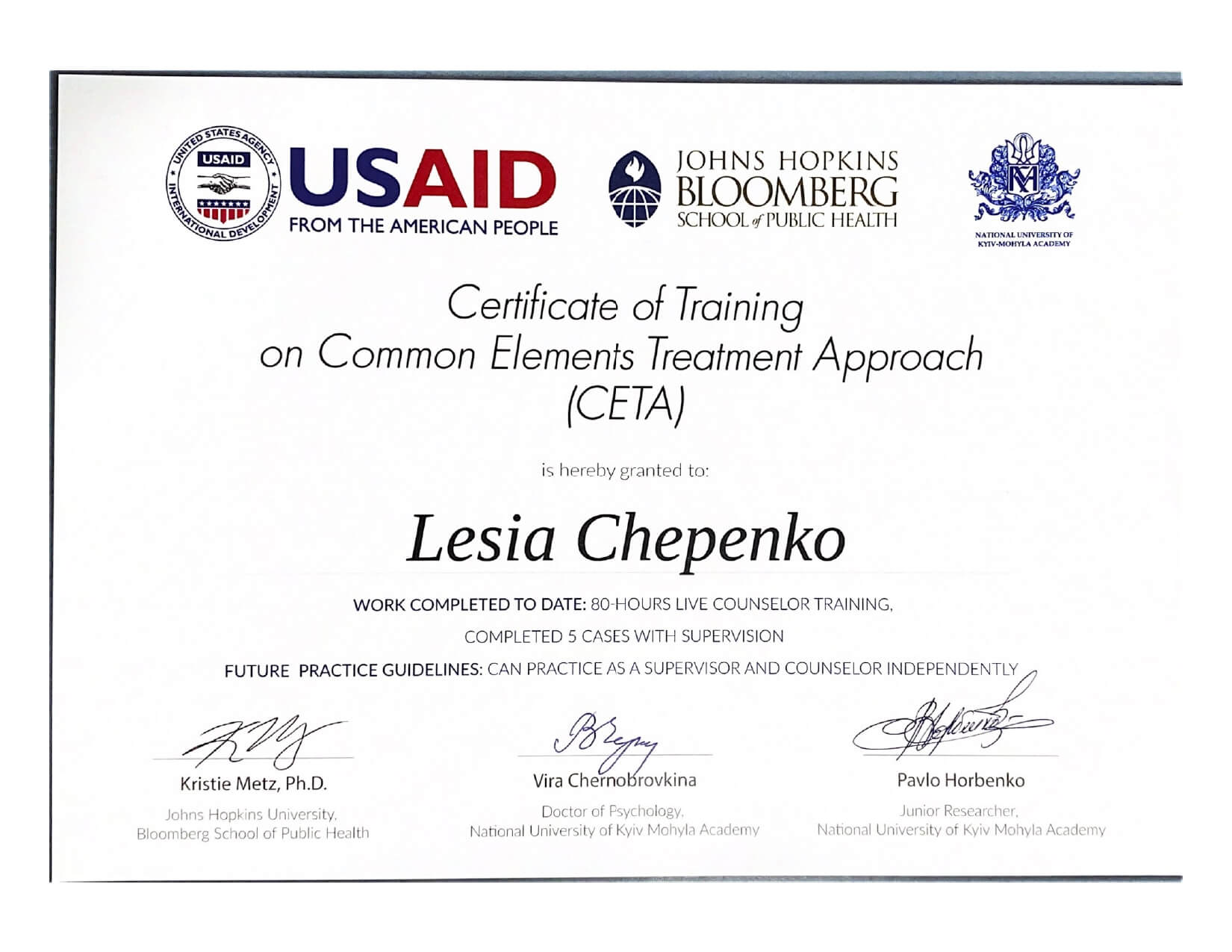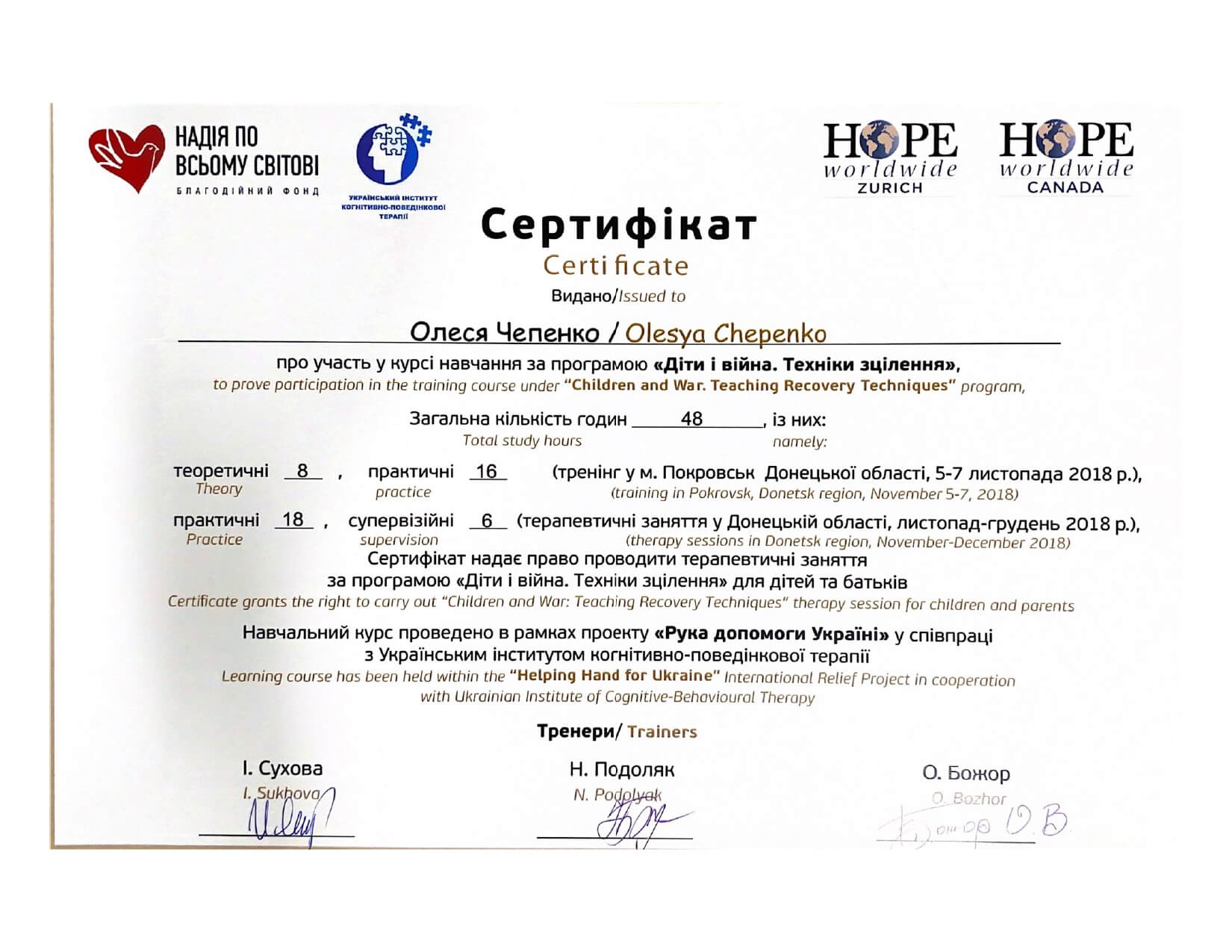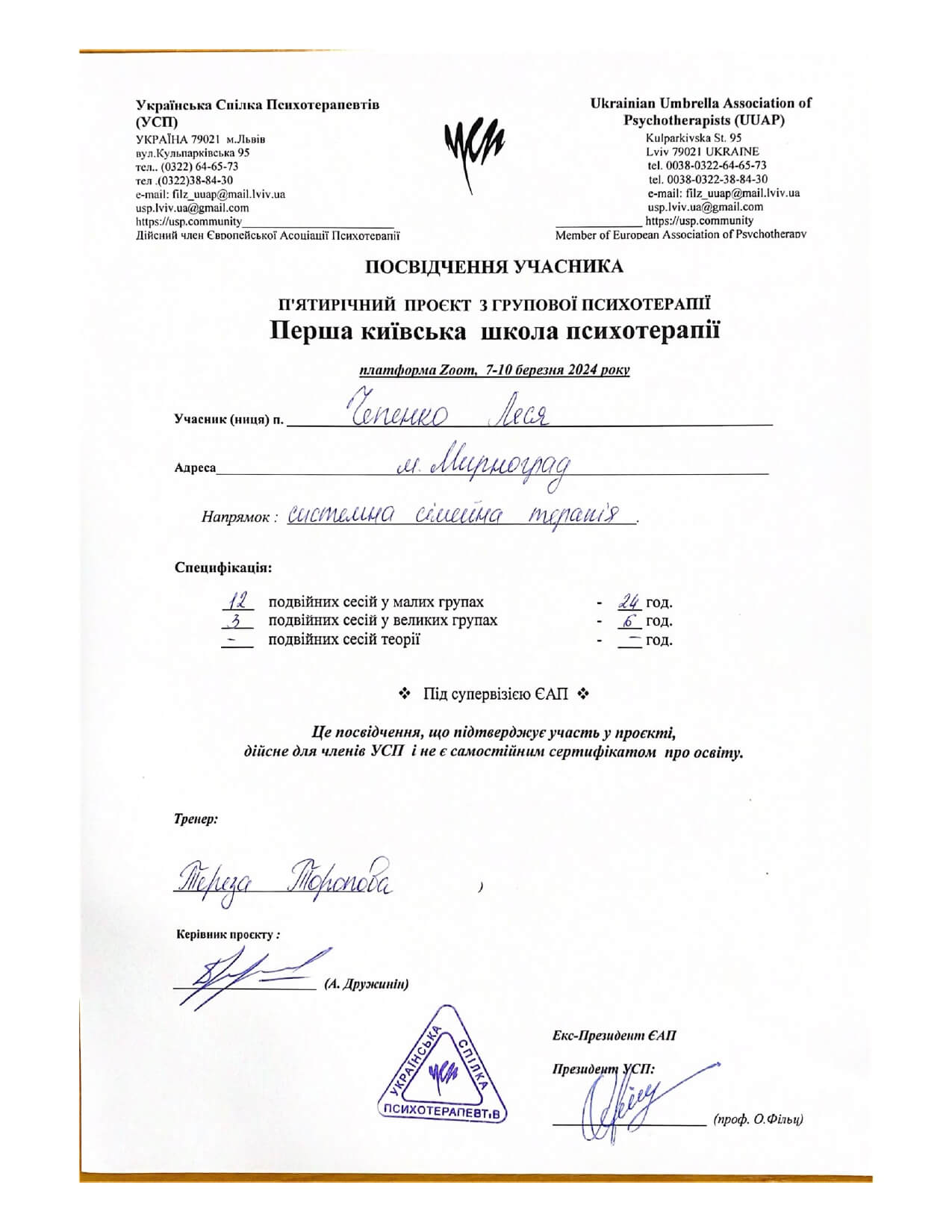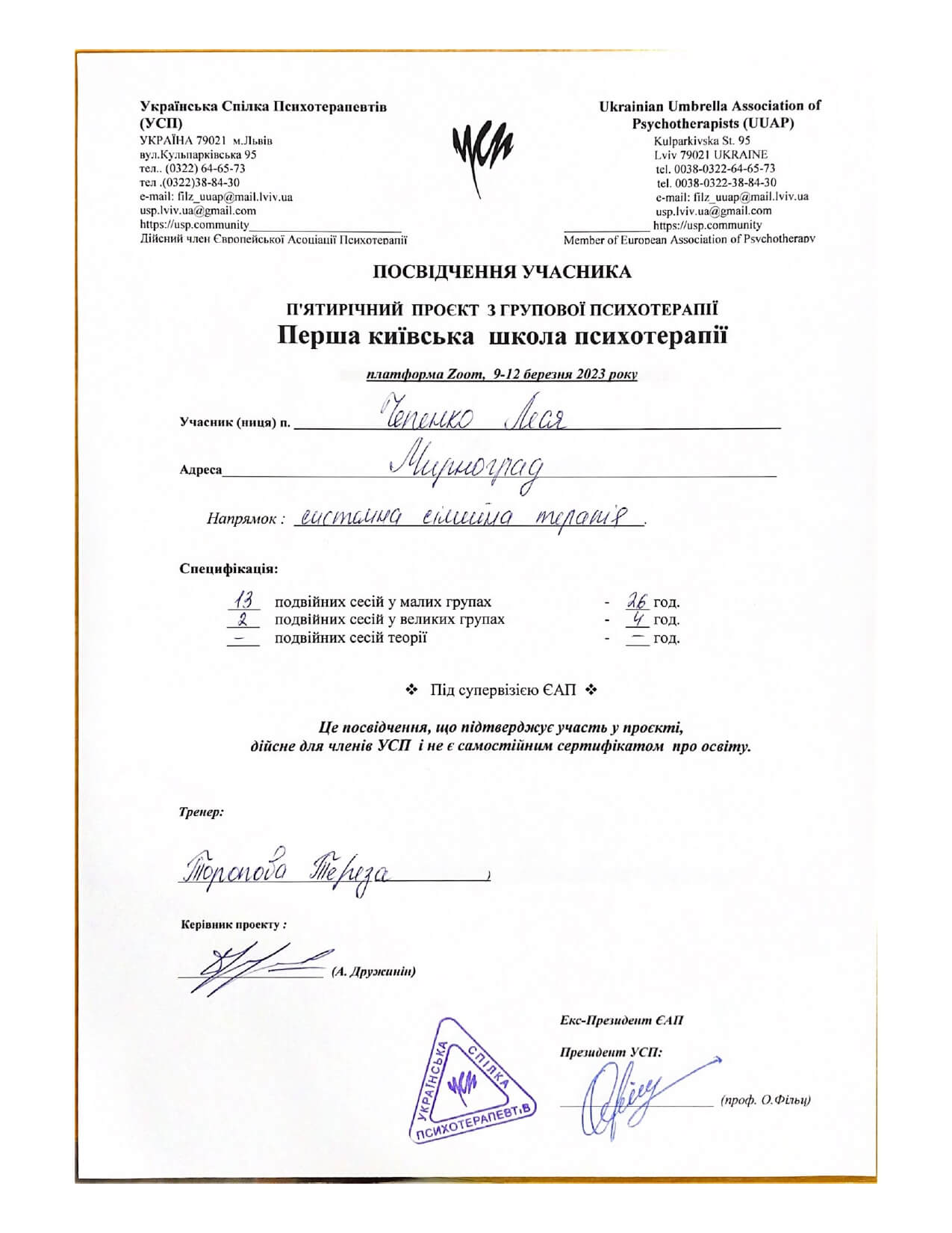 Пройшла навчальний курс за напрямком: Обов’язкова загальна теорія, специфікація: Психіатрія «Пропедевтика психіатріі» (Школа розвитку психотерапії, УСП), 156 годин - березень-червень 2023 року