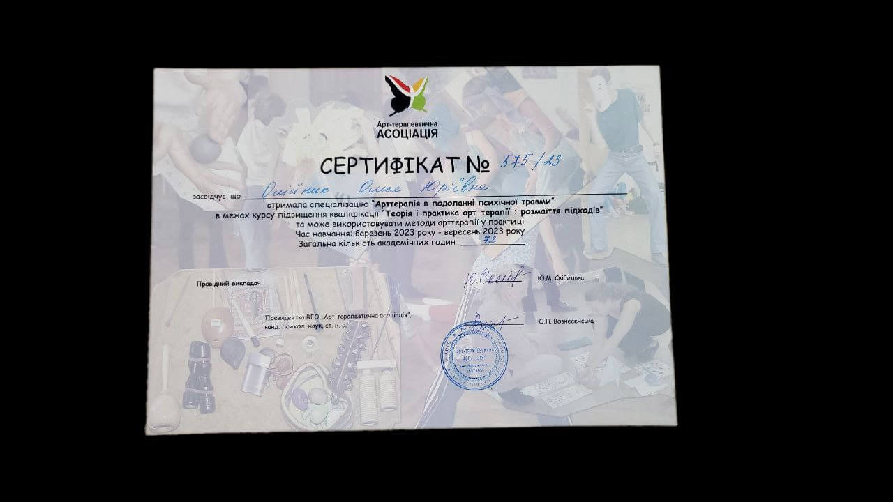 2023 р. – ВГО "Арт-терапевтична асоціація", спеціалізація "Арттерапія у подоланні психічної травми". Під керівництвом Скібицької Ю. та Вознесенської О. Київ, Сертифікат №575/23