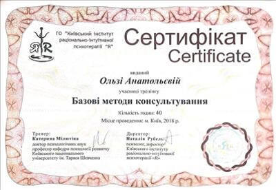 Київський національний університет імені Тараса Шевченка (психологія), Київський інститут раціонально-інтуїтивної психотерапії "Я", Institute Japan Yoga Niketan (Інститут психологічного та фізичного здоров'я Йога Нікетан, Японія)