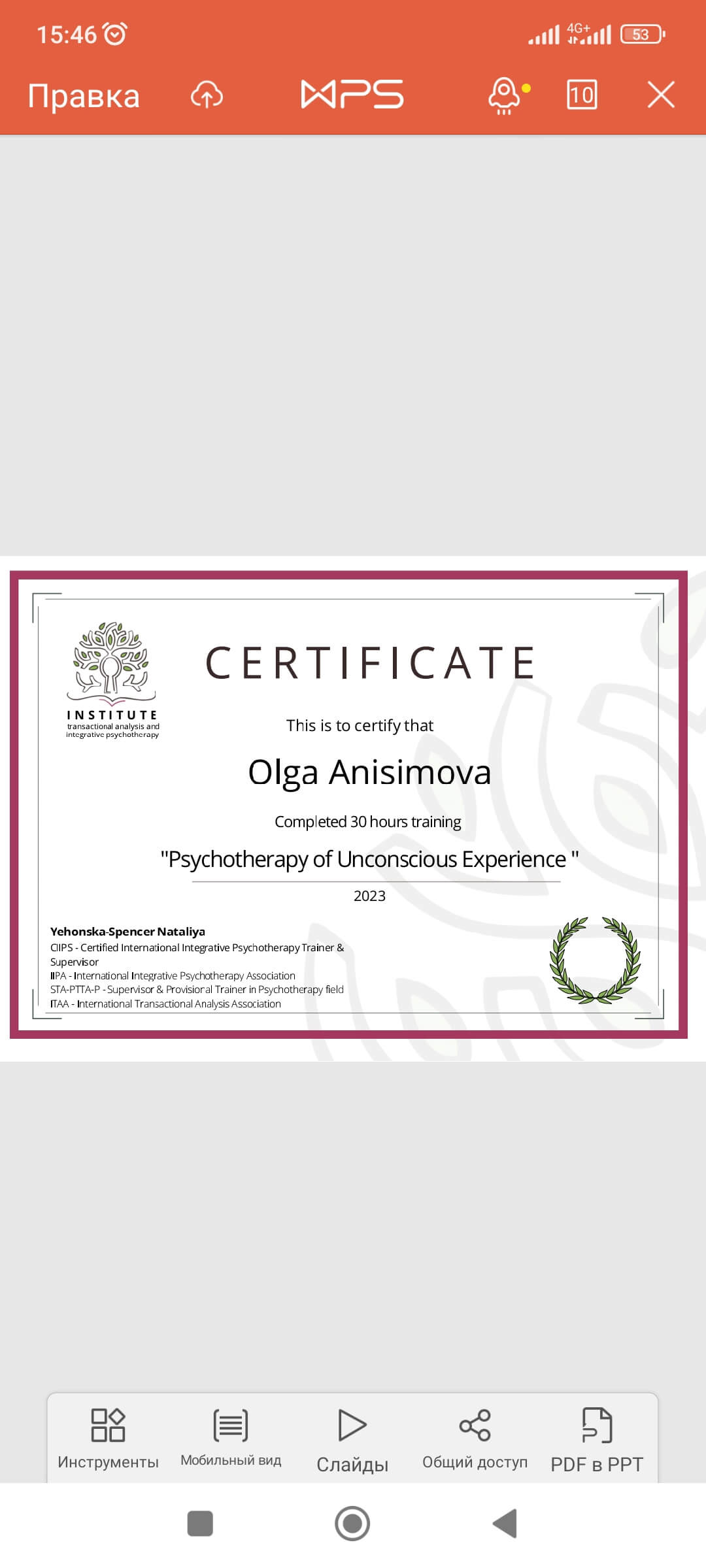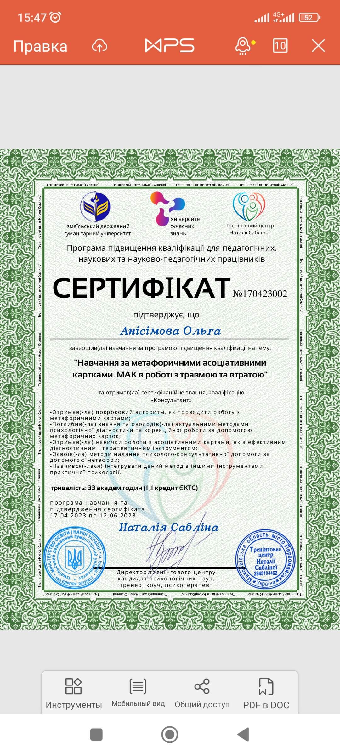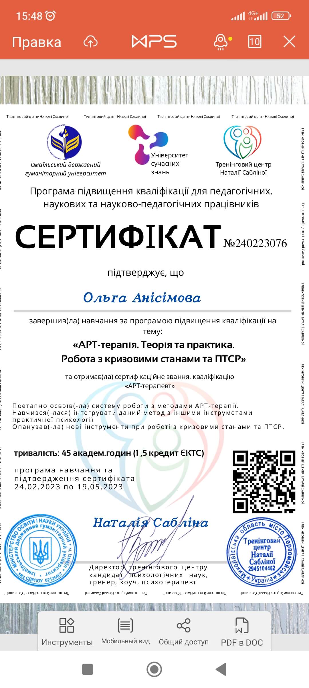 Харківський Національний Університет ім. Каразіна факультет психології. Та маю курси підвищення кваліфікації з арт-терапії