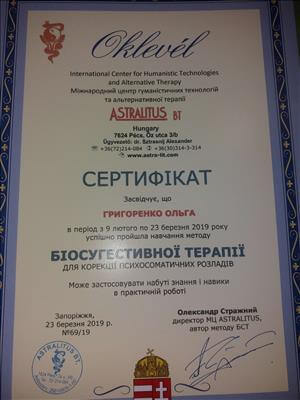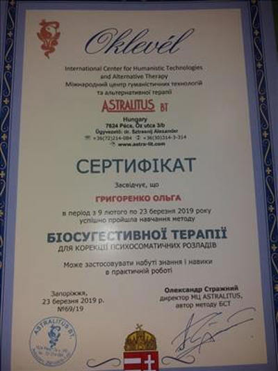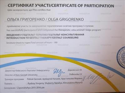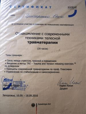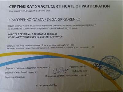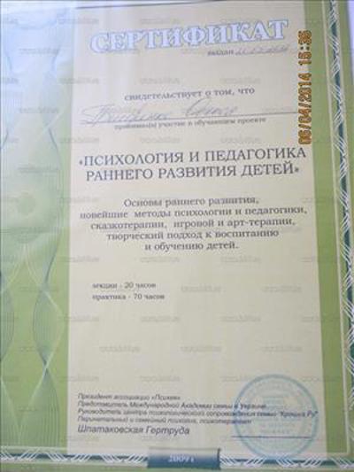 Групповой тренер в гештальтподходе Киевский Гештальт Университет. Репродуктивный психолог Одесская Ассоциация Перинатальных психологов. Сейчас я продолжаю в обучение в психосоматической подходе. Кризисная психология Запорожская Кризисная служба. Детская и подростковая психология Ассоциация Перинатальных психологов и педагогов.