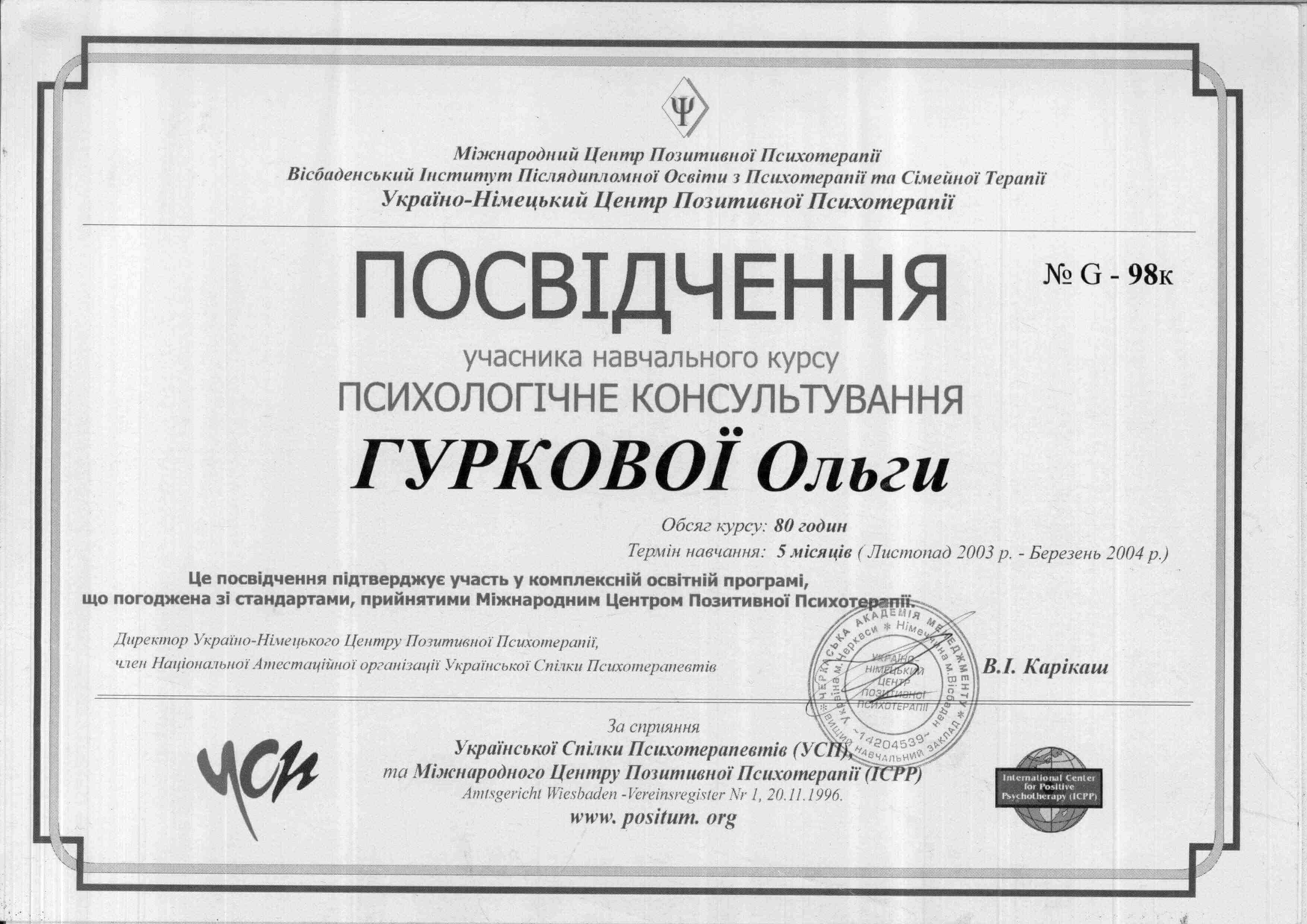 2. Вісбаденський Інститут Позитивної Психотерапії, 2003р.