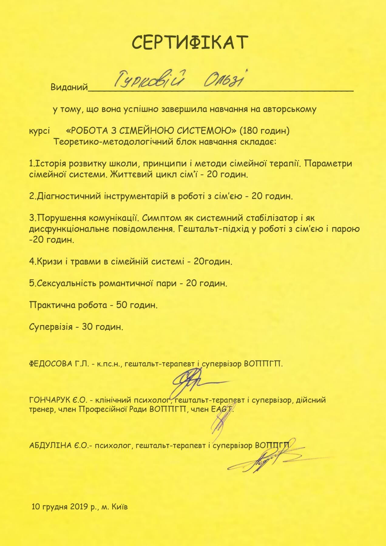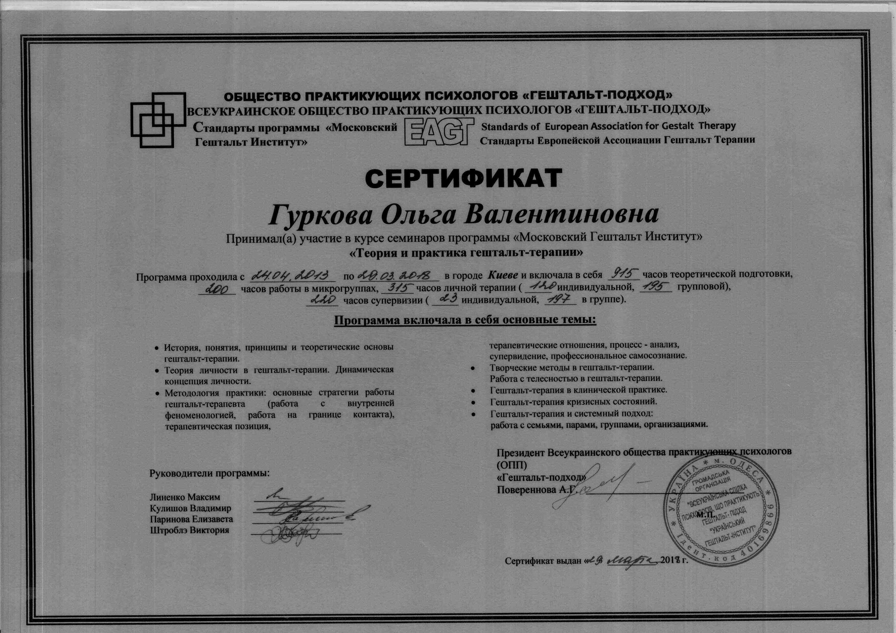 1. Московський Гештальт Інститут (сертифікований спеціаліст), 2018р.