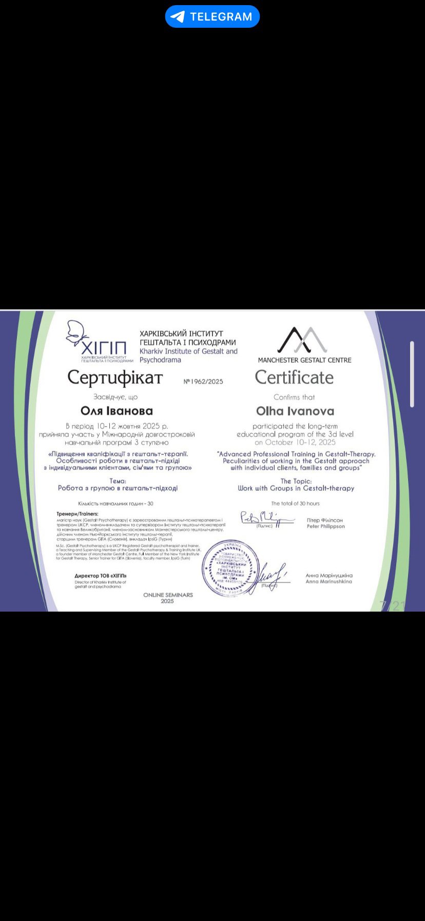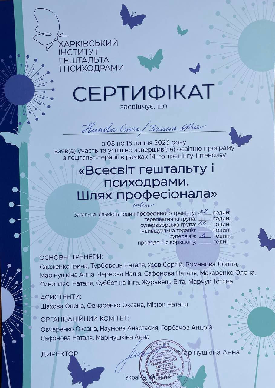 З 16.05.2025 року проходжу навчання на ІІІ ступені підвищення кваліфікації гештальттерапевтів. Навчання триватиме 3,5 років