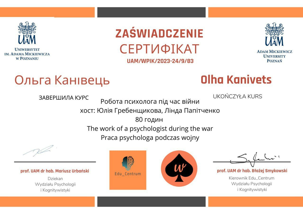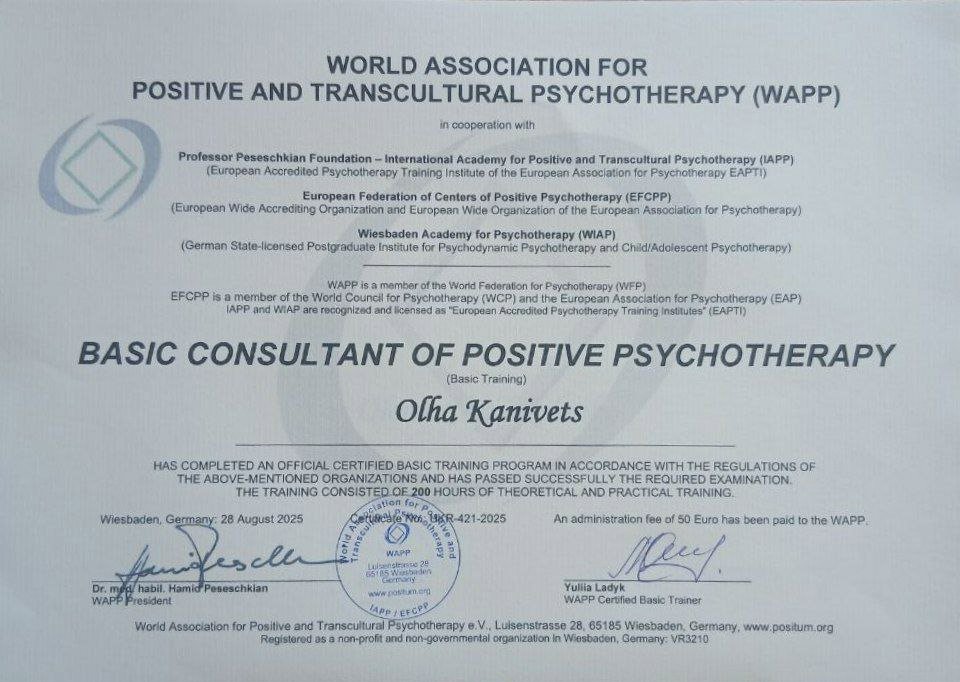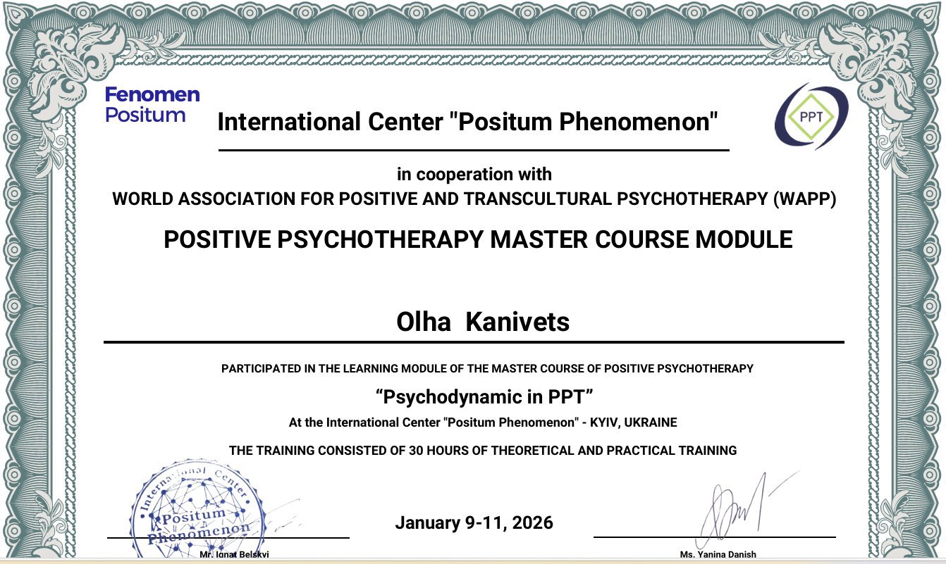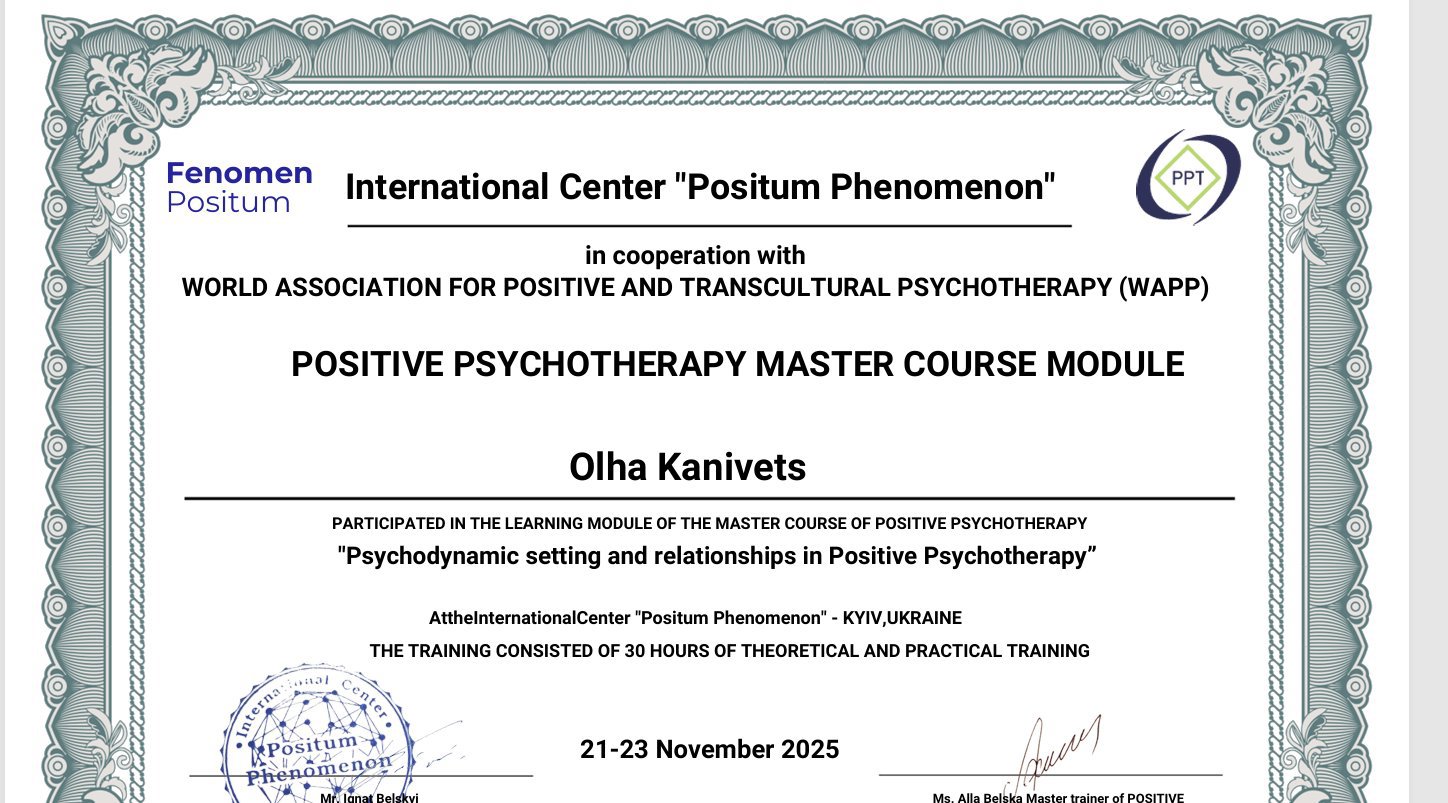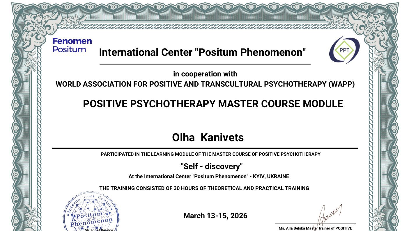 Я і мій шлях у психологію — це свідомий вибір зрілої людини, підкріплений фундаментальною освітою та величезним життєвим досвідом. Сьогодні я практикую як сертифікований консультант у методі Позитивної психотерапії та є членом Всесвітньої асоціації WAPP (Вісбаден, Німеччина), продовжуючи навчання на майстер-курсі для отримання статусу психотерапевта.