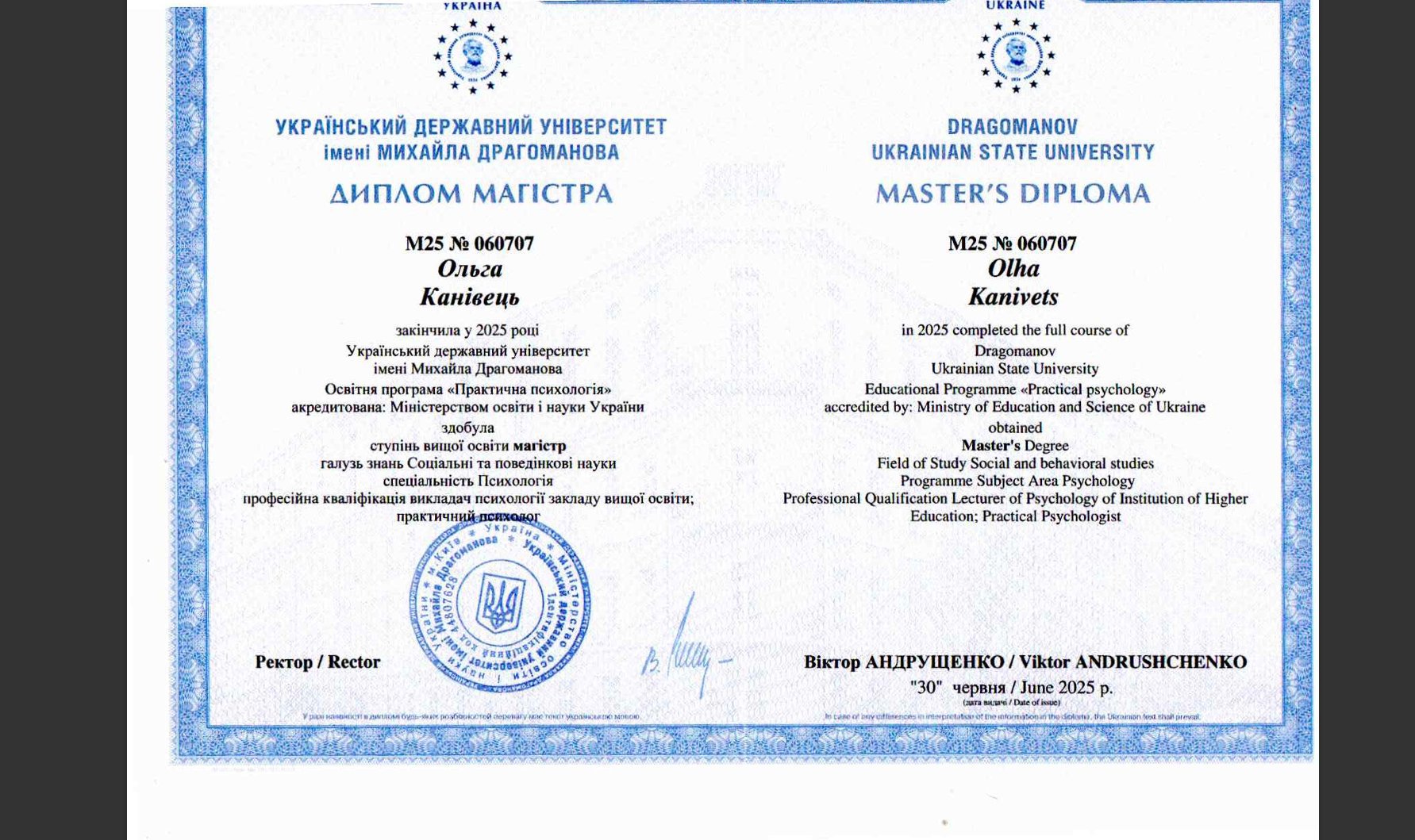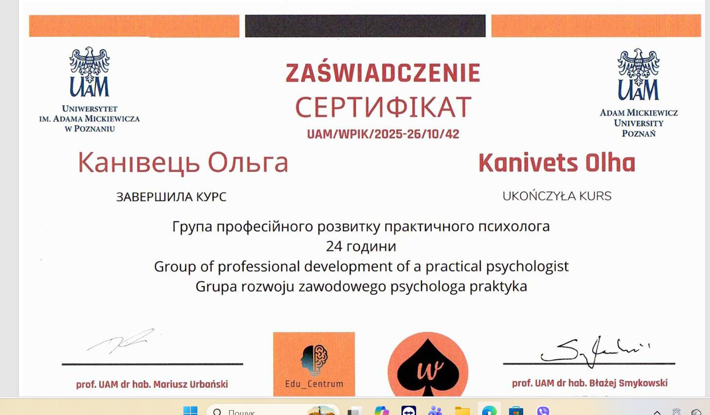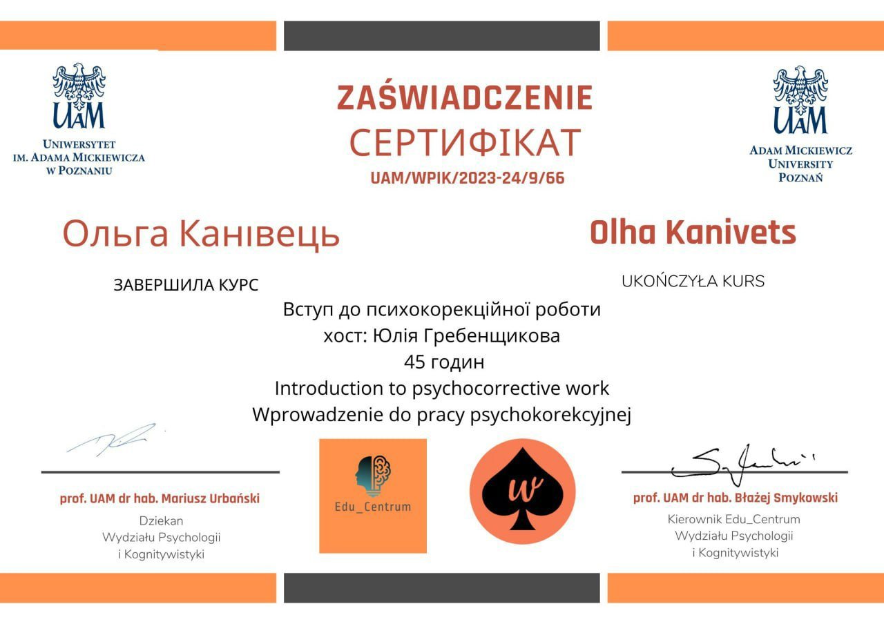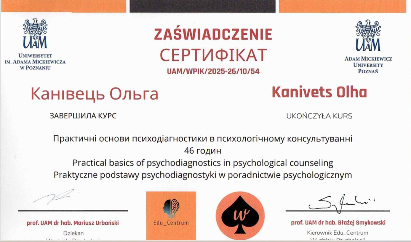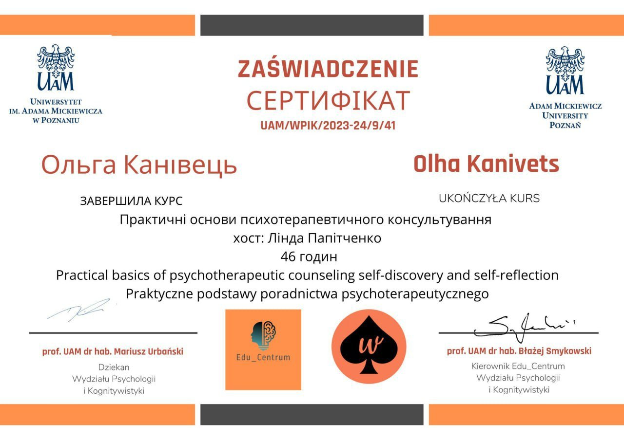 Я і мій шлях у психологію — це свідомий вибір зрілої людини, підкріплений фундаментальною освітою та величезним життєвим досвідом. Сьогодні я практикую як сертифікований консультант у методі Позитивної психотерапії та є членом Всесвітньої асоціації WAPP (Вісбаден, Німеччина), продовжуючи навчання на майстер-курсі для отримання статусу психотерапевта.