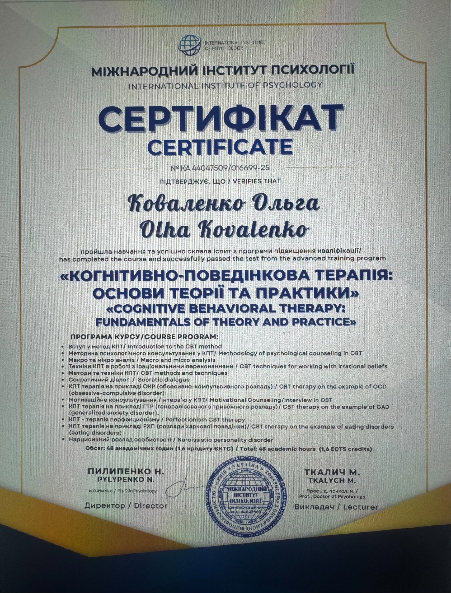 - Міжнародний Інститут Психології - Програма Підвищення Кваліфікаціі "Когнітивно-Поведінкова Терапія: Основи Теорії та Практики"