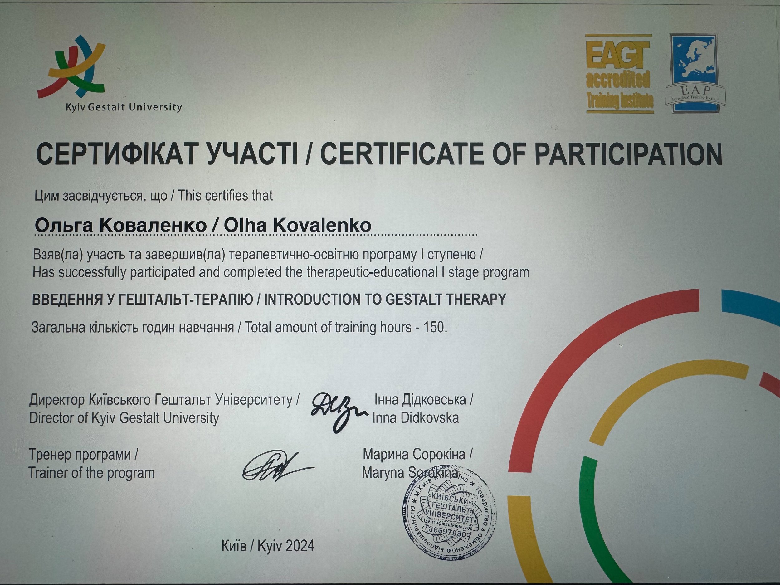 - Київський Гештальт Університет - Терапевтично-Освітня Програма 1 ступеня, зараз навчаюся на 2-му ступені