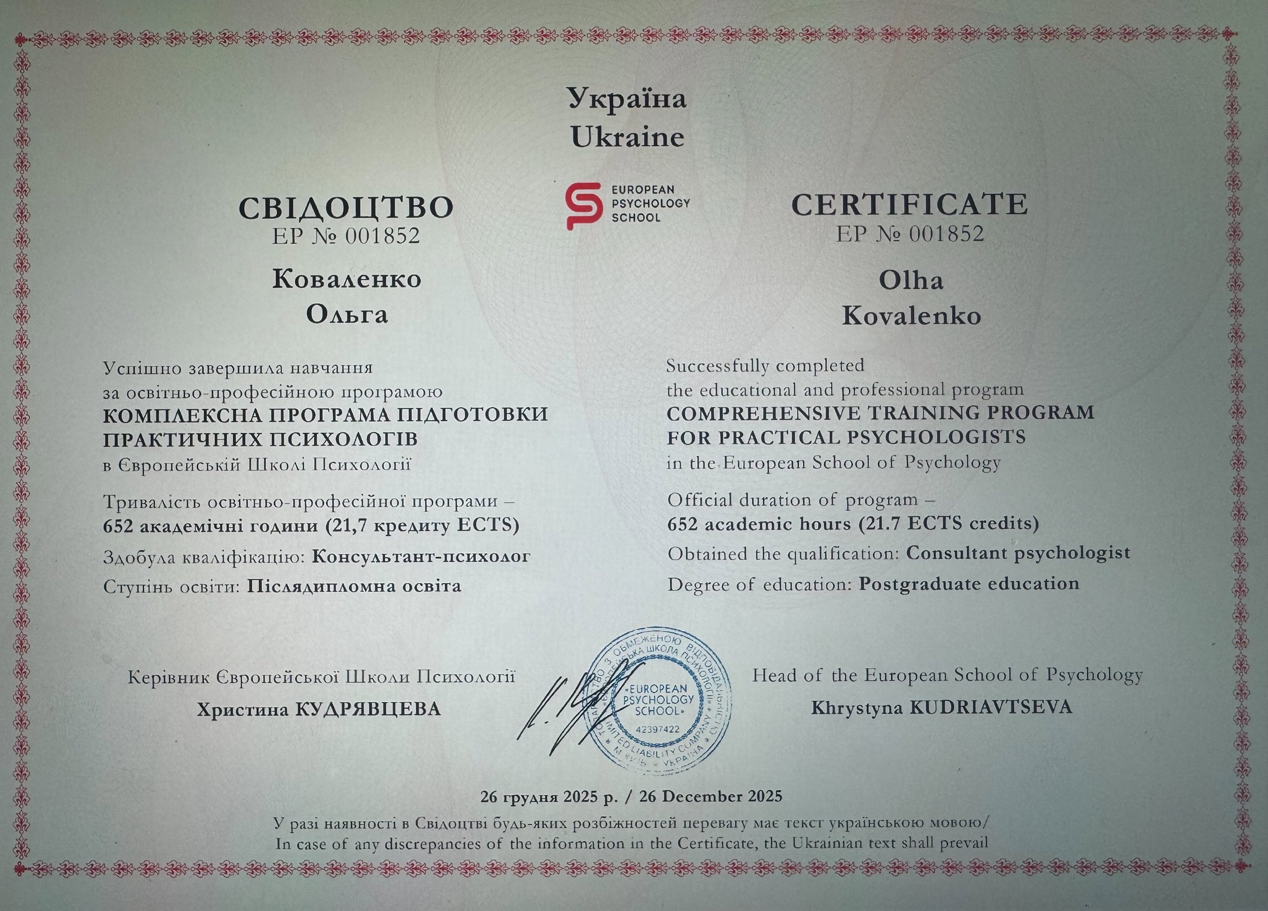 - Європейська Школа Психології - Післядипломна Освіта, Комплексна Програма Підготовки Практичних Психологів, Кваліфікація - Психолог-консультант