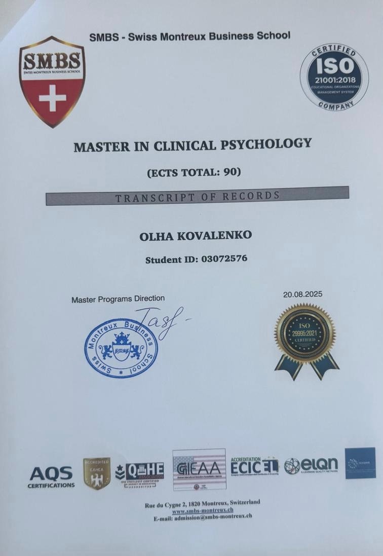 - Swiss Montreux Business School - Master in Clinical Psycology (Магістр з Клінічної Психології)