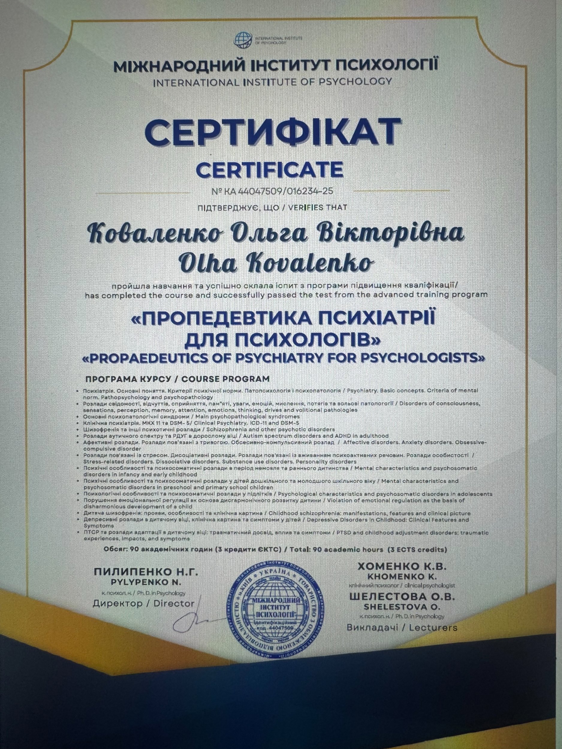 - Міжнародний Інститут Психології - Програма підвищення кваліфікаціі "Пропедевтика Психіатрії для Психологів"